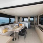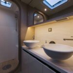 Accessible directly from the cabin by a few steps, the owner’s bathroom occupies 2/3 of the starboard float. It is equipped with a sink area with two basins, a shower and separate toilets, and plenty of storage space.