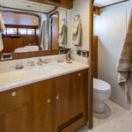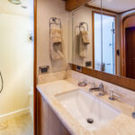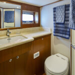 The first change that Rhapsody’s owner made was to the living spaces. Any good long-range cruiser has a bounty of spots for family and guests to spread out, and Rhapsody’s 18-foot, 6-inch beam allows for room to breathe. This owner forwent the standard athwartships double berth in favor of two twin berths, with the option to slide them together to make a queen-size berth when needed. He also wanted a centerline master stateroom instead of the standard athwartships layout, a change that involved resituating the head and doing away with one of the boat’s three engine room access points—a growing trend among Outer Reef owners who prefer the centerline arrangement. With a king-size walkaround bed, a walk-in closet, an ensuite head and enlarged portlights, the full-beam master stateroom underscores the owner’s intention to carve out his own peaceful oasis for extended cruising.