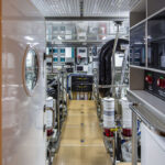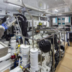 When you put “owner-operator” and “long-range” in the same sentence, the layout of the engine room is key. Aboard Rhapsody, everything that might ever need to be serviced has a hatch and a lighted compartment with easy access. Even the cleats have interior access panels for repairs. The engine room provides well-lighted, walkaround access to each engine, the generators and the electrical systems. Even with a workbench in the after area of the boat, there’s still plenty of room to stow tools and create a separate workspace within the engine room.