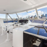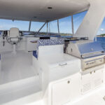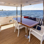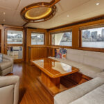Rhapsody has a main deck with a traditional interior and contemporary accents, including a custom handcrafted overhead wood handrail with recessed lights in the ceiling. The open concept layout, a hallmark of the Outer Reef line, allows for sightlines that stretch all the way forward to the pilothouse from the covered aft deck. For night runs, or anytime the skipper prefers privacy, an electric partition rises from abaft the pilothouse settee to separate the lower helm from the open galley and salon.