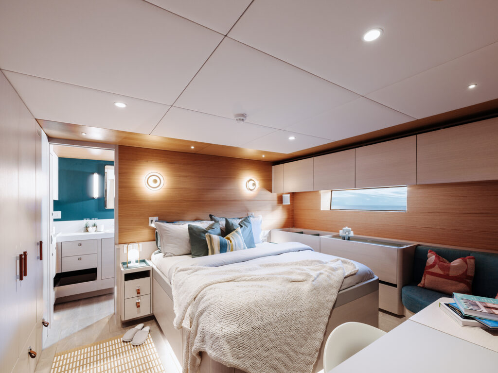 The shipyard offers flexibility in the accommodations, within the limits of the engine-room bulkhead and watertight compartments. The standard main-deck layout has a U-shape galley amidships with dining and seating forward. Belowdecks, the master stateroom is amidships to port, with an office and a spare berth to starboard. Twin-berth staterooms just forward convert into doubles. In the bow on the starboard side, opposite the laundry and stowage, is a twin-bunk, en suite stateroom for guests or crew. The berths are all 6 feet, 6 inches long, and headroom is just under 7 feet.