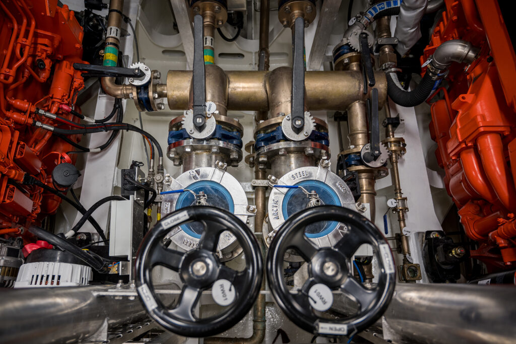 The owner is an experienced yachtsman with ambitions to cruise independently, well off the beaten track. He wanted systems redundancy in the engine room, from the second genset up, to prevent annoying issues from becoming itinerary-ending problems. He also wanted a folding lower helm station at the forward end of the salon. Being closer to the waterline than the wheelhouse, it will be more comfortable in heavy weather, and will be a more sociable spot for watchkeeping on long passages.