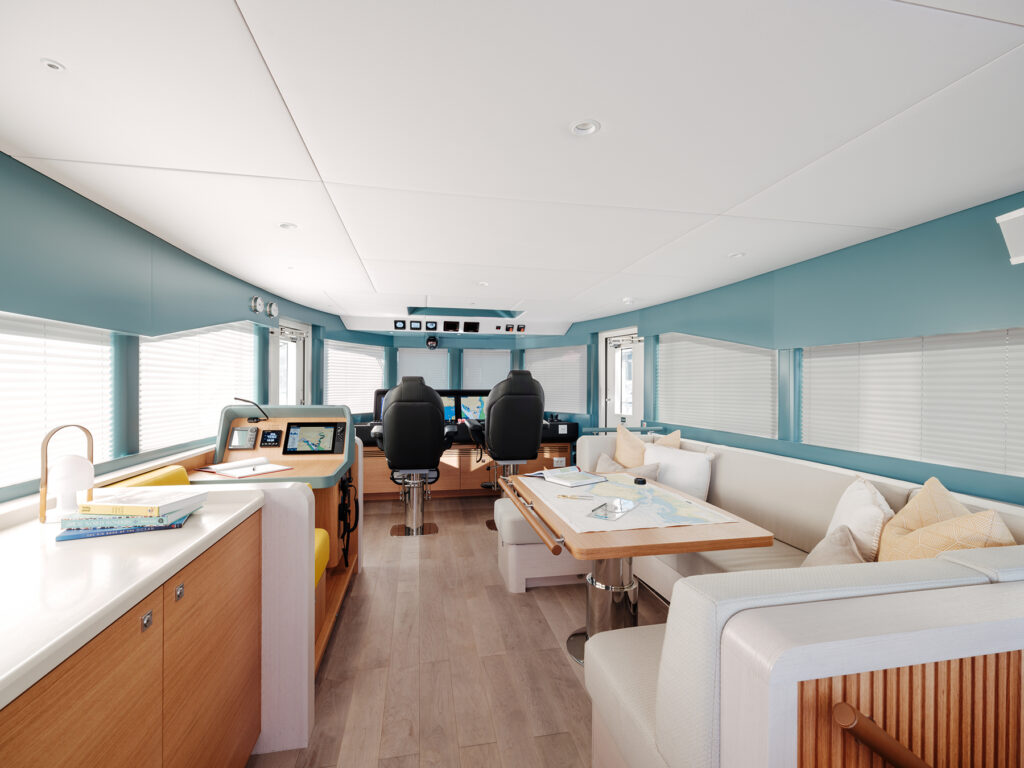 Up in the wheelhouse, there is excellent visibility from the four-screen helm station. There’s also plenty of seating, a breakfast table with a handrail (that table is large enough to open a chart), and a separate navigator’s station to port. For close-quarters maneuvering, there are wing stations on each side and another one aft. Yet another practical idea is the two-door airlock-style entry to the main deck, with a folding seat to remove sea boots, and a heated locker to hang up sodden foul-weather gear.