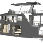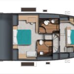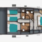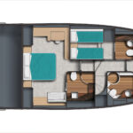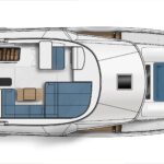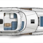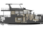 The lower deck comes with three optional layouts: 1) standard three staterooms; 2) two large staterooms; or 3) three cabins. In options 2 and 3, the forward master stateroom can be fitted with stairs and a companionway, which allows direct access to the foredeck. (All layouts have the option of an aft crew quarters.)