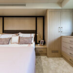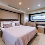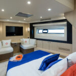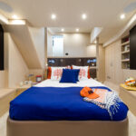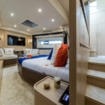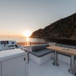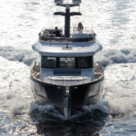 The word here is “balance.” Spadolini took a minimalist contemporary approach in the salon, allowing a roomy aft deck lounging area with a large settee and an outdoor dining table. Natural light from the wraparound windows gives the interior a feeling of spaciousness. There is plenty of elbow room to accommodate the natural traffic patterns of onboard guests. A glass door abaft the salon merges the interior and exterior, noticeably extending the overall living space on deck.