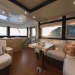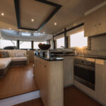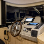 The 58’s interior styling, fit, and finish is on par with the best of world-market competition, with an array of genuinely comfortable spaces, styled with joinerwork and furniture in finishes that enhance the yacht’s airy and open ambiance. Wraparound glass in the main deck house encompasses the salon, pilothouse, and the popular galley aft, which caters to inside/outside dining. Large built-in settees provide adequate seating for any likely complement of guests. The lower helm area is tucked neatly out of the way, in the European manner.