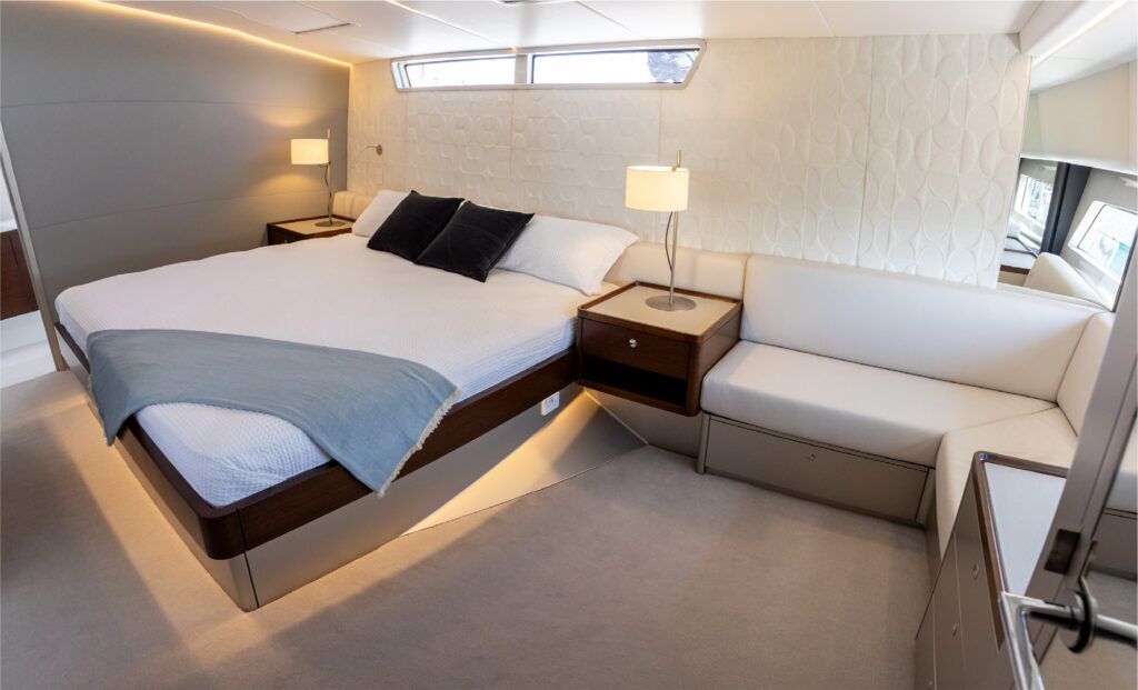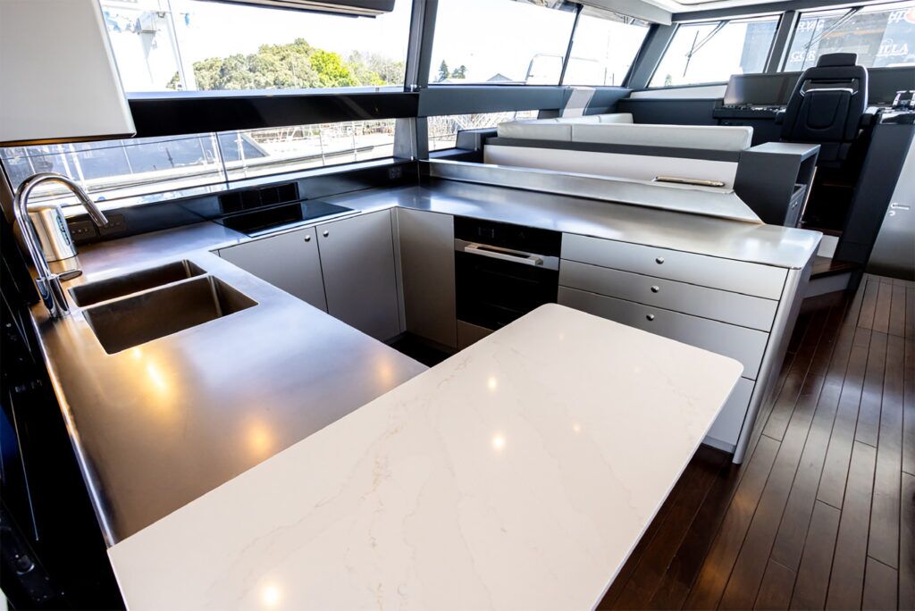 Heeley’s five tenets of an ideal powercat are: sightlines, as in four-corner visibility from the helm; toy stowage, more than a mere locker for fins and goggles; the biggest tender possible while still fitting in a garage; no planing hump, but instead fuel efficiency across various speeds; and range at speed.