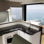 The 465 will have the option for two or three cabins. The standard layout includes the owner’s full-beam cabin amidships, with an en suite head and shower, and the VIP cabin with a double bed and access to the second head and shower in the bow. The third cabin on the starboard side can be outfitted with twin bunks or can be used as a study or utility room.