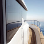 The galley will be near the aft deck, serving a dining area forward to port. A sofa and single helm are to starboard with a door opening to the side deck. The bow will feature a large sun pad and a cantilevered hydraulic swim platform will be aft.