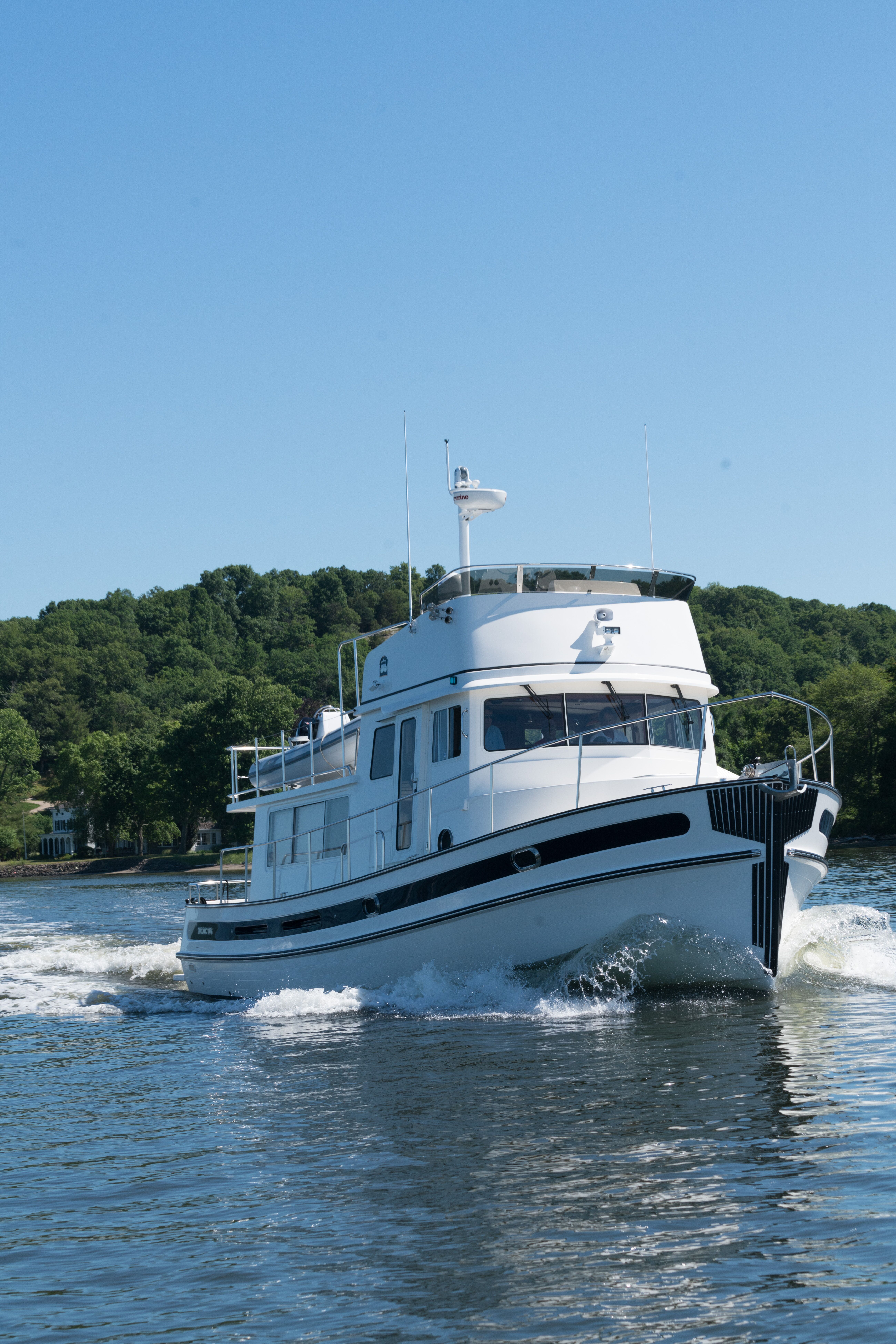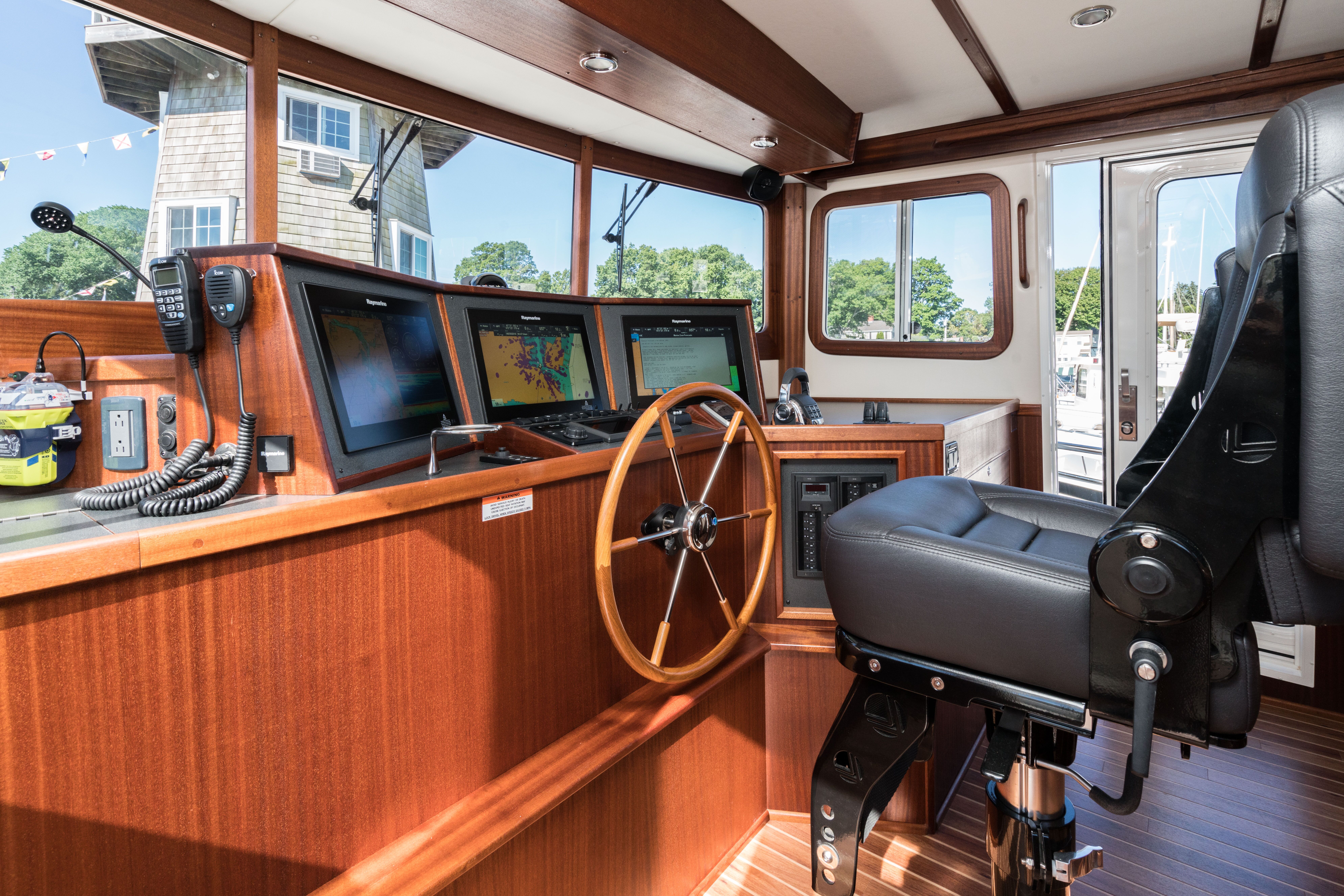 Weathertight Diamond Sea Glaze doors on each side give immediate access to the side decks. And there are Sapele handholds overhead and next to the doors; this is a safe boat. It also is responsive. As we headed up the river, the boat came on plane with barely a bow rise without using trim tabs, easily reaching 15 knots. The Volvo D11 diesel, detuned here to 510 horsepower, is designed to produce high torque at low rpm. Maneuvering at speed is a pleasure: The large destroyer-type wheel is 4-¾ turns lock to lock. Around the dock, Side-Power proportional bow and stern thrusters make it easy.