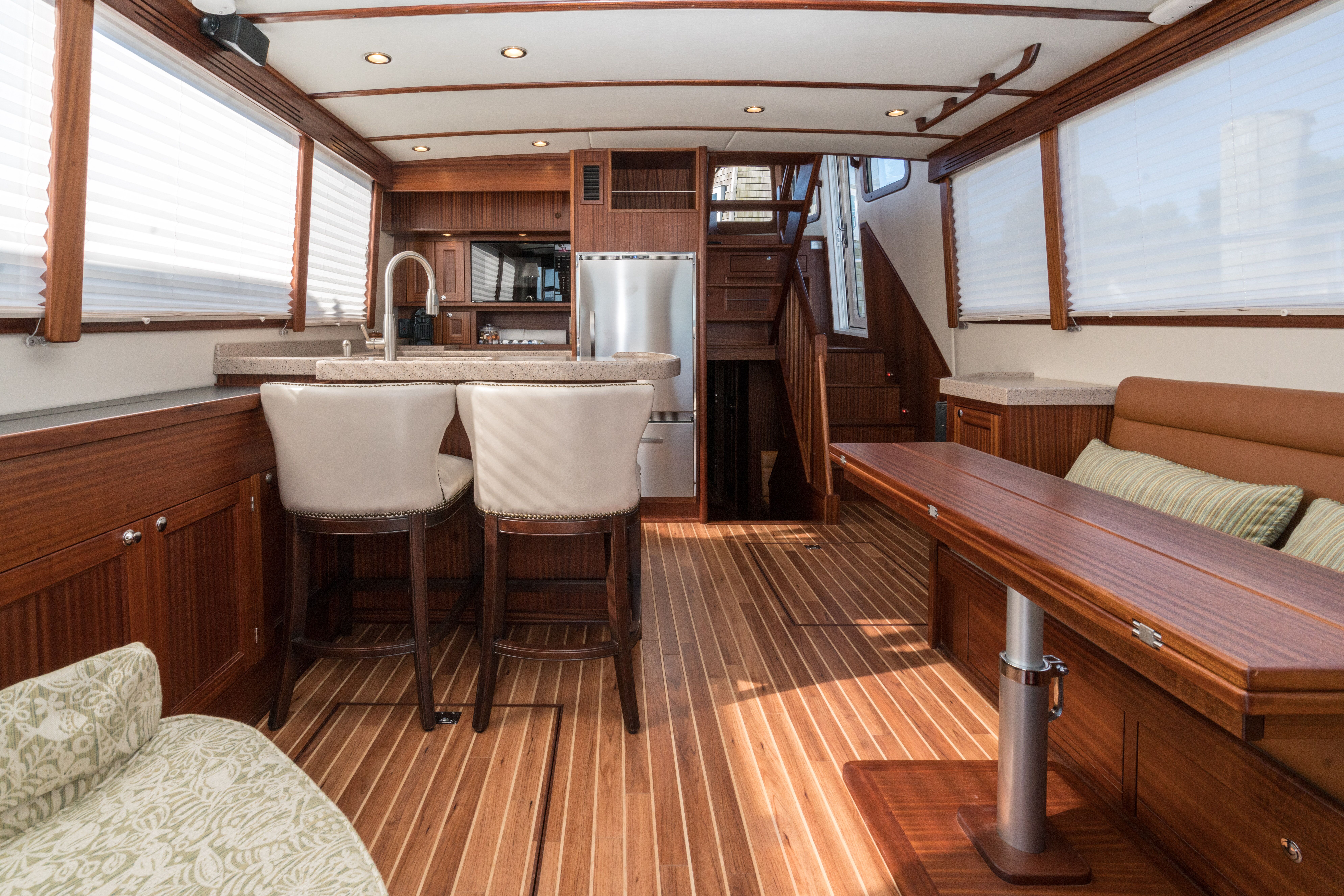 Two glass doors lead to the saloon, which allows plenty of light from these doors and from big side windows. A modern, large L-shape galley is aft, immediately inside the doors to starboard. It has a stainless sink, convection microwave, three-burner stove, and Sapele-faced drawers and cabinets. A 5-foot fridge/freezer is forward, backing up to the pilothouse. The countertop runs all along the starboard side and has four large drawers under the after section, and if you leave the doors open you can fold out an extension of the Corian countertop to serve guests in the cockpit (a very nice touch).