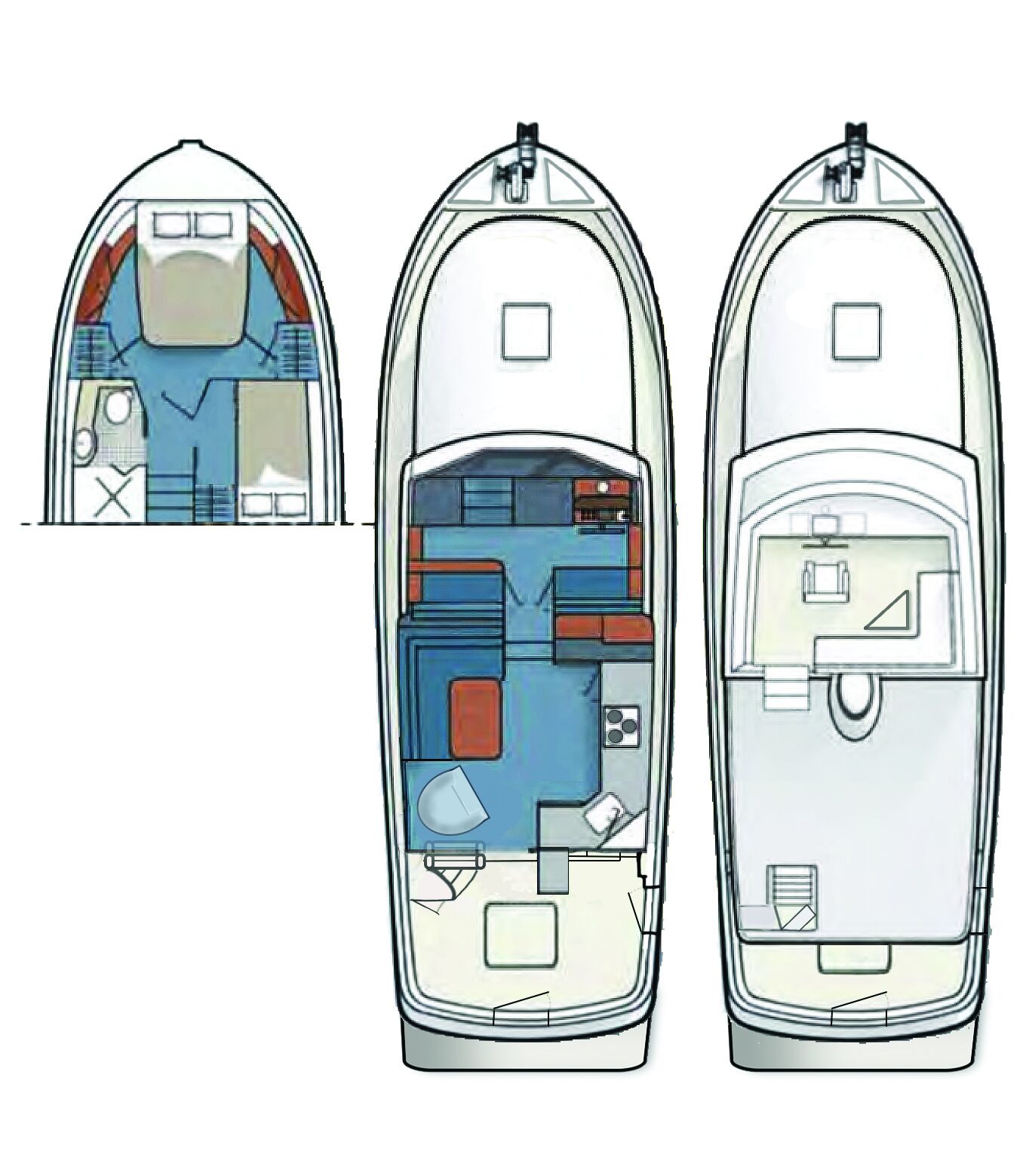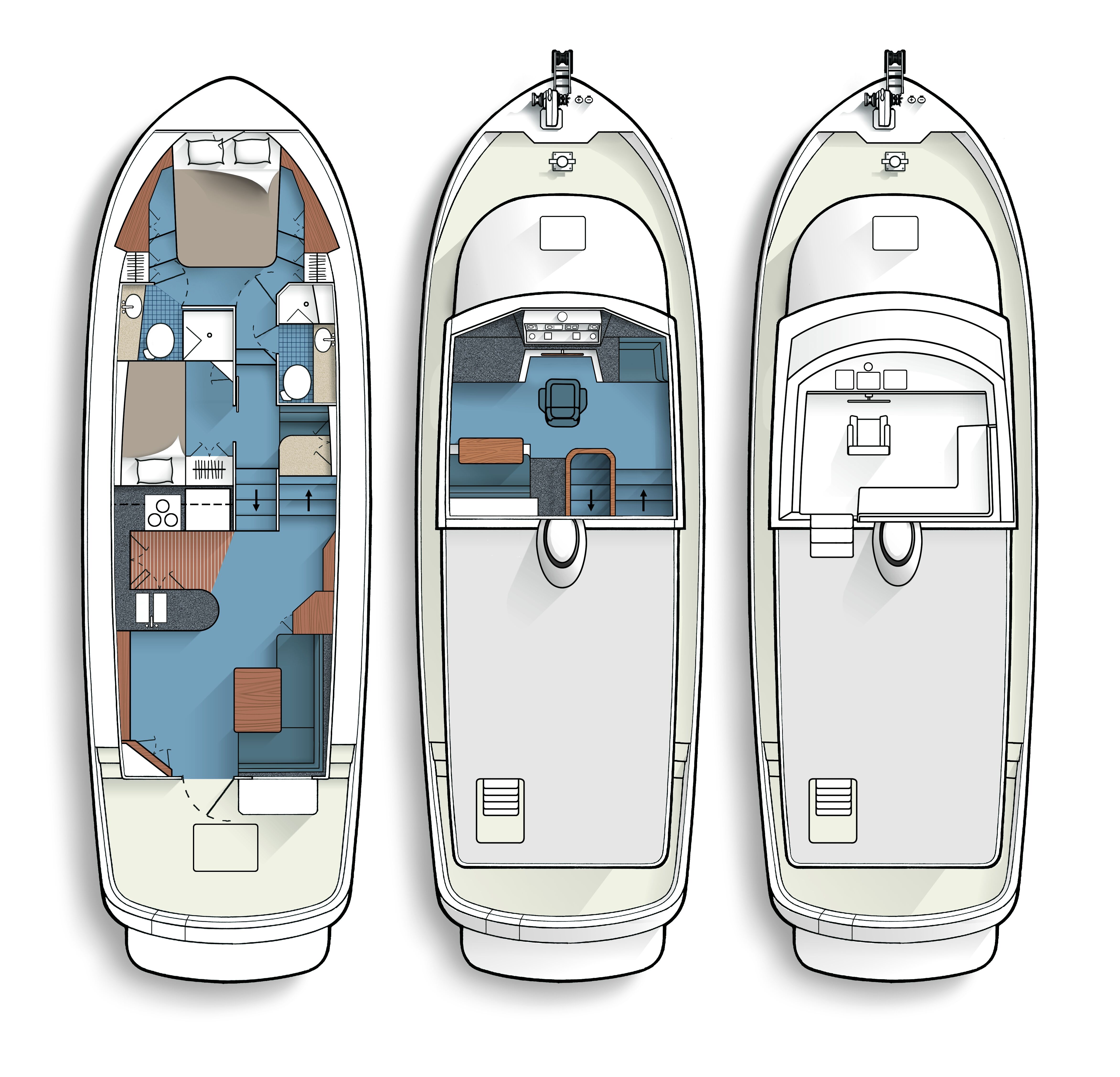 From the pilothouse, three steps lead down to the accommodation deck, where the guest cabin is on the starboard side. On this boat, there’s just a lower berth here, although an upper is available as an option. Two side ports and an overhead hatch let in plenty of light. A hanging locker with two lower drawers and a separate cabinet provide storage.