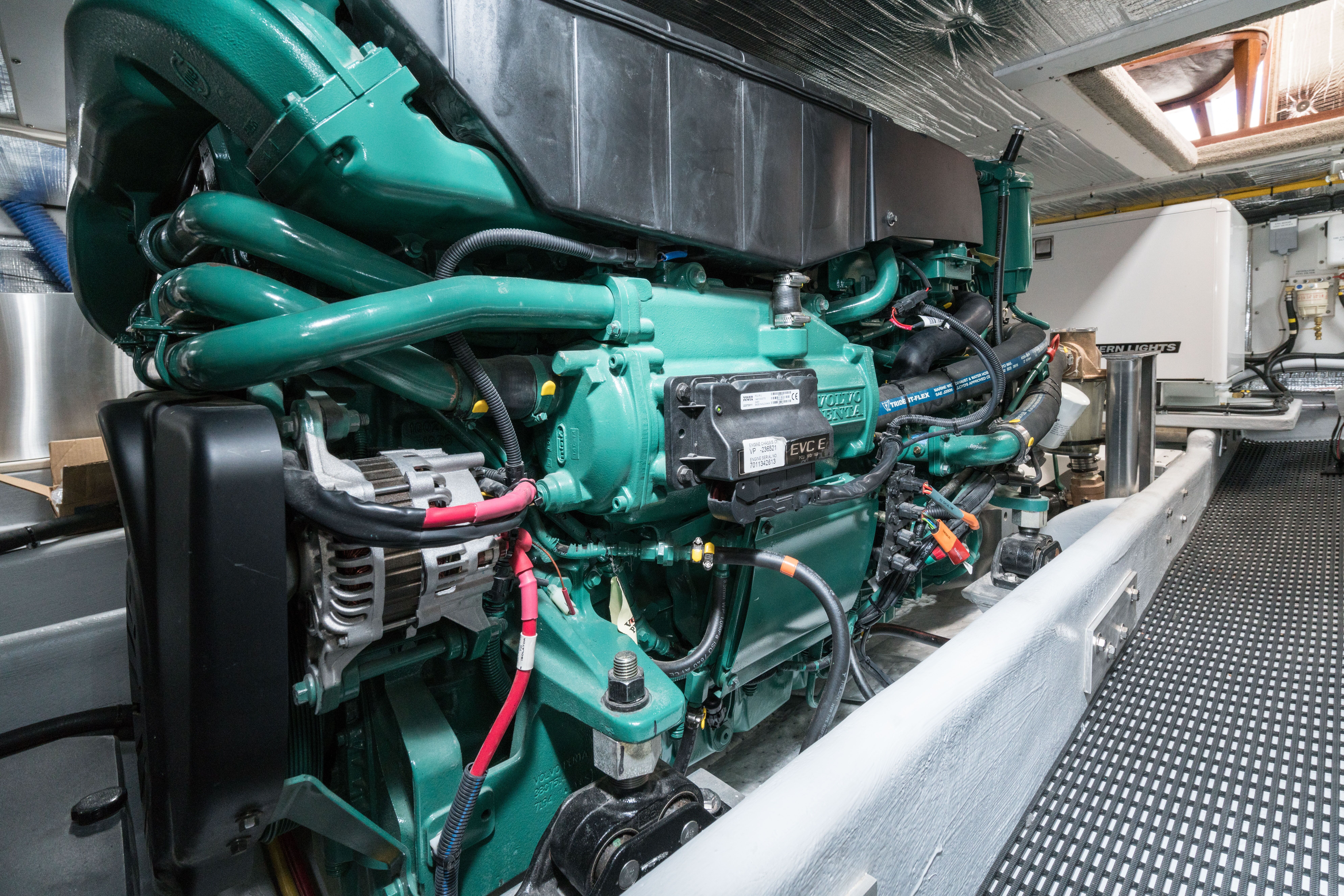 Lifting two hatches in the center of the pilothouse sole allows easy access to the engine room. Two big Racors are on the after bulkhead, the big Grocco is forward, and there’s room to work all around the D6, 370-horsepower Volvo. The 9kW Northern Lights genset is abaft the engine, although the owner, a former sailor, will use it only for the air conditioning because the boat is equipped with propane for cooking.