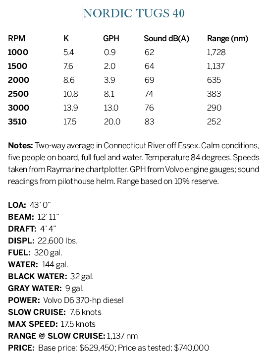 Then, as we cruised up the Connecticut River past Hamburg Cove on a beautiful blue-sky, blue-water summer day, I nudged the throttle forward and the single 510-horsepower Volvo diesel urged the boat to a steady and solid 17 knots. I realized this was a boat to be reckoned with. Then, a few days later, I tested the new Nordic Tugs 40, which performed just as well, also topping out at 17 knots, and reached the same conclusion.