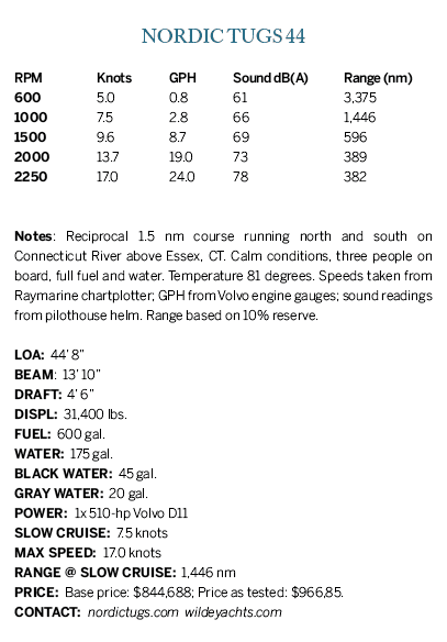 Today, Wilde Yacht Sales in Essex, Connecticut, is the largest Nordic Tugs dealer, and that’s where I tested the 44 and 40. The 44 has an optional flybridge, so it had to be trucked to Wilde’s facility outside Annapolis, where Ben Wilde and the owners, a Boston-based doctor and his wife, picked it up for a three-day cruise to Essex. The new owners, typically, were sailors, although they did have a powerboat: a 19-foot Boston Whaler. They ran into some snarly conditions on the second day running up the Jersey shore, but Wilde says “they were very impressed how the boat handled the conditions. The full keel helps with steering in heavy weather; the boat tracks straight.” The new owners, like many others, he says, were attracted to the new 44, “by the large pilothouse, great visibility, direct access to the flybridge from the pilothouse, great walkaround side decks, two heads with showers, and great headroom.”