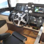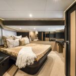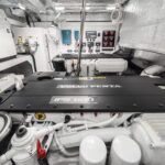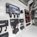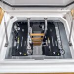 The engine room is accessible from a large deck hatch on a hydraulic lift, down a steep but manageable ladder into a commodious engine bay. The twin Volvo IPS600 diesels looked as tidy as under the hood of a brand-new Mercedes. Gone are myriad runs of hoses and wires; here, everything is neatly contained in logical runs. The water manifold on the port side was as neat an installation of services I’ve seen. The forward side of the engine room holds a powerful Onan 13.5 kW generator, which powers six separate A/C units totaling 74,000 BTU. Both engine water intakes are very accessible nearby.