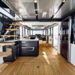 On the subject of performance, Ferragni said, “The Duo Mode hull means that I design a hull ready for smooth cruising at 12 to 14 knots in semi-displacement [that is] also [able] to reach top speed without losing safety, smooth behavior on the waves, and good fuel consumption.” He continued, “The transition between semi-displacement and planing at top speed is very soft and it does not need too much power and consumption. It is the customer who chooses the gait and type of navigation, not the hull.”
