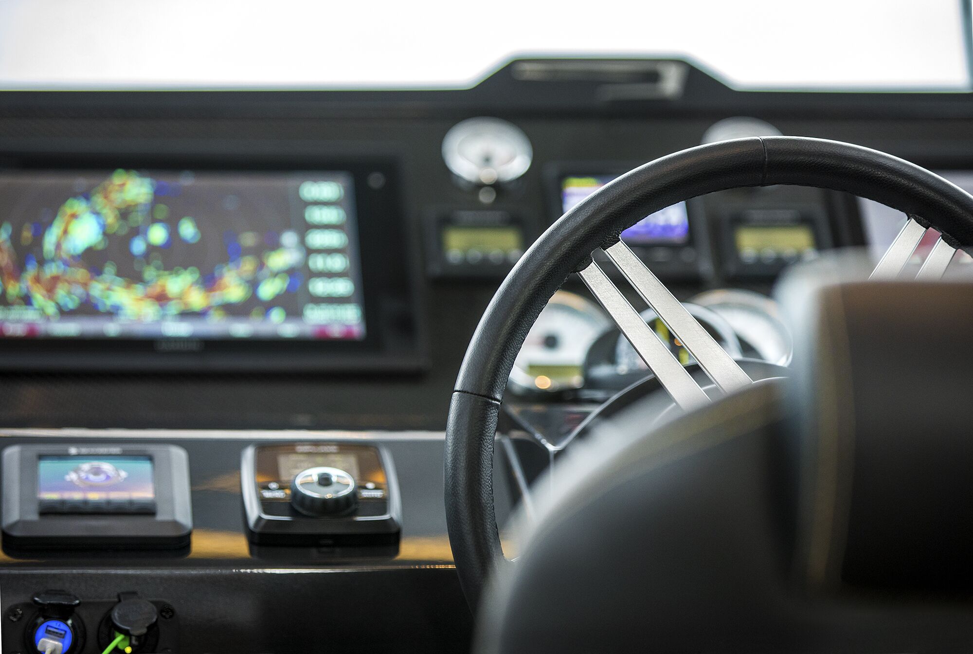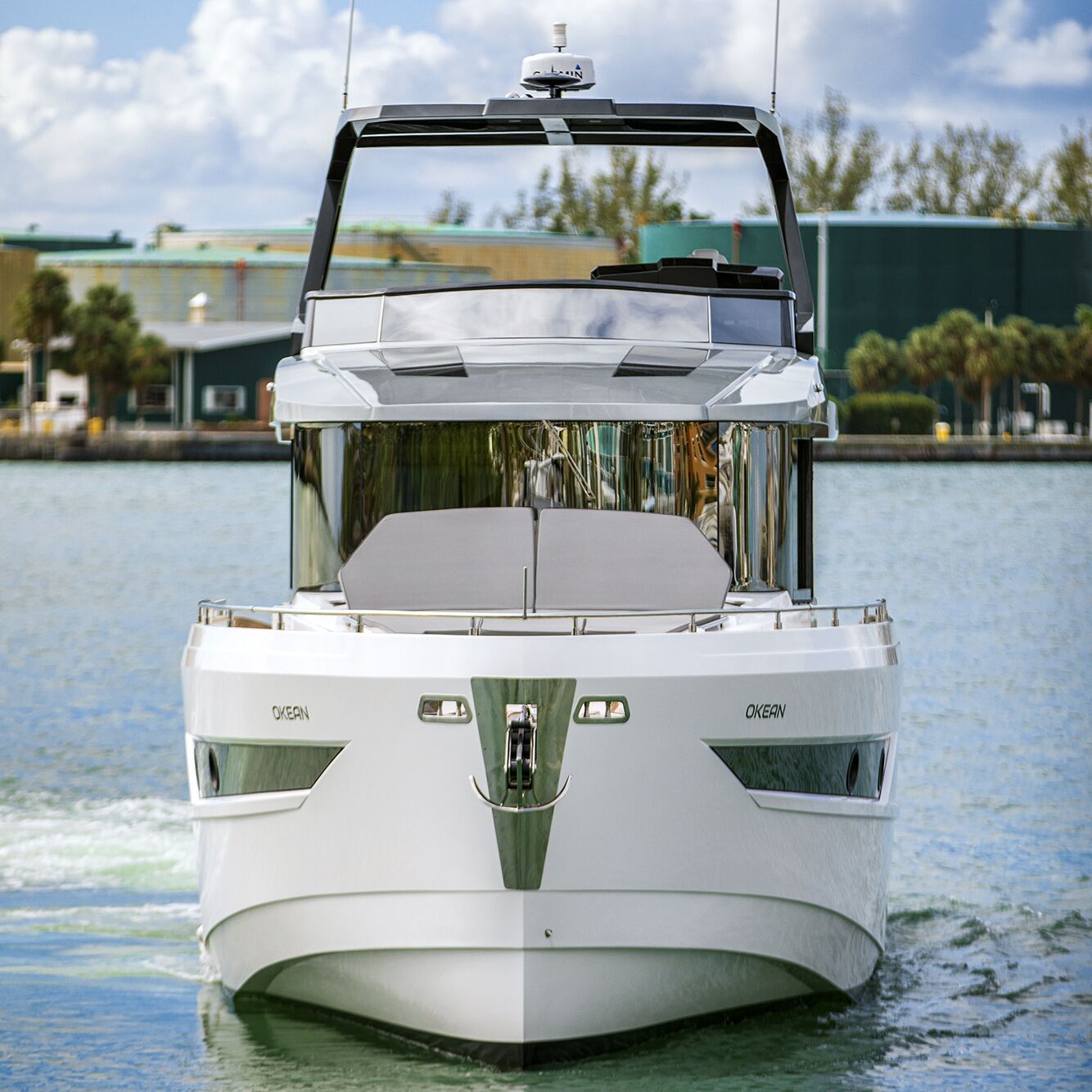 Captain Alex Faga eased the Okean 50 out of the slip into a tight fairway for our test just as the first ocean-borne squall brought rain and wind from off our bow. HMY’s Arthur Grin and I watched as he deftly manipulated the joystick controlling the twin IPS600 Volvos. Small movements allowed Faga to effortlessly spin the boat in its own length. The complete absence of window frames provides great visibility to the person at the helm, even in spitting rain. The 180-degree windscreen, radiused on both sides, has enough straight surface in the center to allow one large windscreen wiper to provide about three feet of effective sweep.