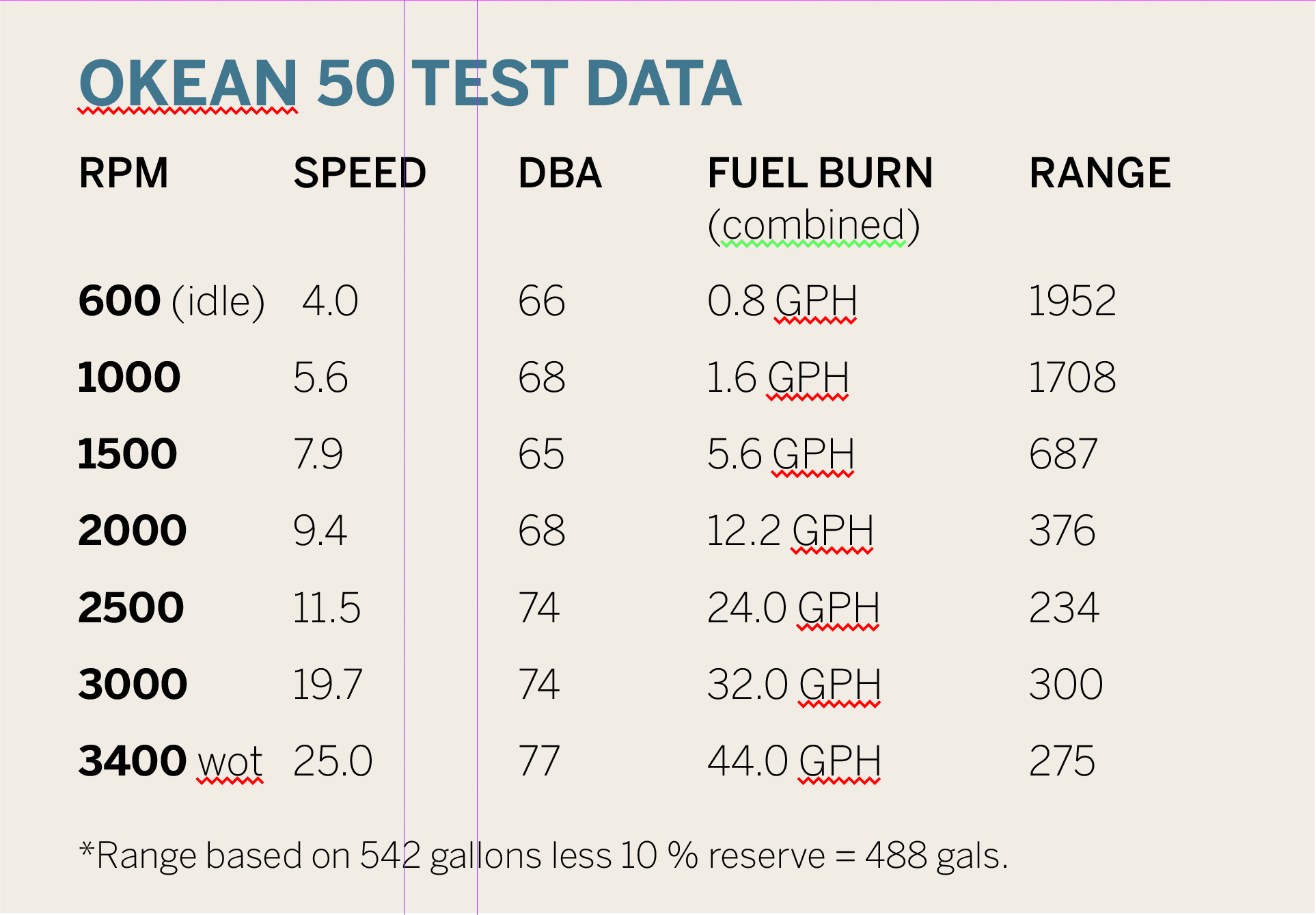 We were limited to sections of the inland waterways without wake restrictions for our testing due to the condition of the ocean. The ride was, of course, smooth as there were no waves. But a few large wakes from other passing boats did give us a chance to appreciate the internal gyro keeping us level at all times. The decibel readings at all speeds were in very comfortable ranges (see test data), and the boat responded well to all maneuvers driven by the pod drives. As we ran the boat from dead idle speed to wide open throttle, the acceleration was smooth, even as we transitioned from nine-knot trawler speed to a brisk and comfortable 20-knot planing speed. The difference in range between these two comfortable speeds was only 76 miles, or about 20%. The numbers bore out one of the principal objectives behind the Okean 50—good performance at displacement and planing speeds. Ferragni utilizes what he refers to as a “Duo Mode” hull design, which is his take on a semi-displacement hull with lifting strakes forward and a 14-degree deadrise in the stern.