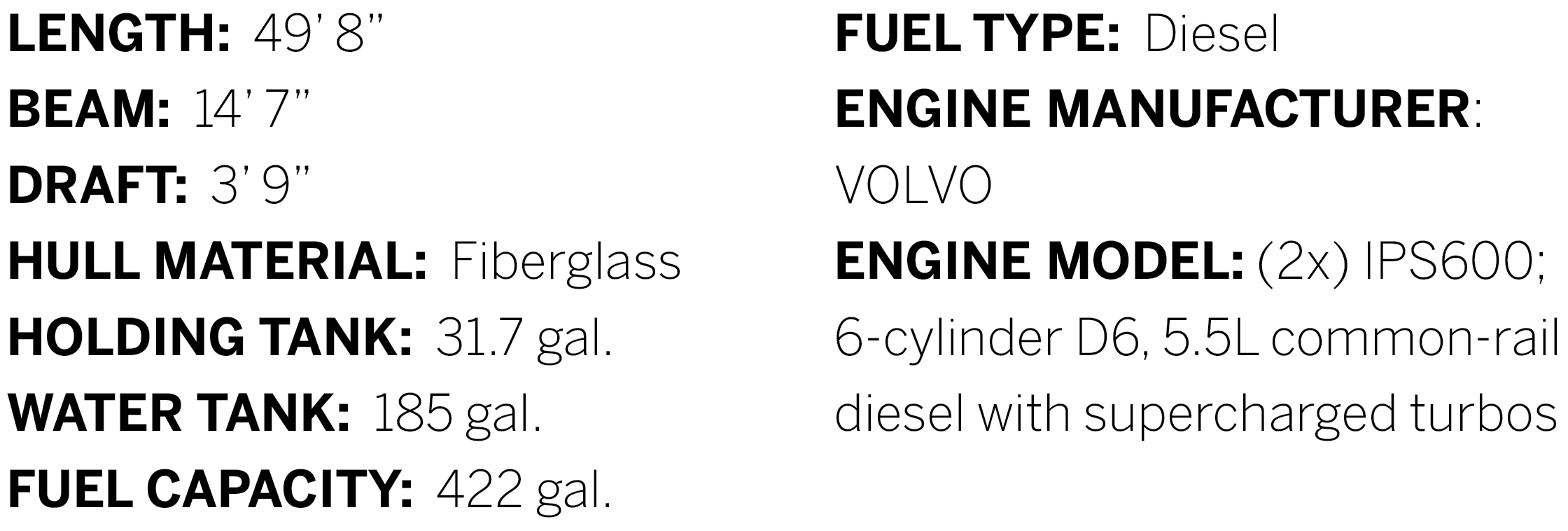Anna RamalhoThrough connections that he had made within the Italian yacht design community, he chose to work with Milanese designer Paolo Ferragni. Ferragni’s design studio has developed recreational boats for builders and owners throughout Europe for 15 years. The design objective for the new line was to create a series of innovative yachts from 50 to 80 feet, built to CE standards with a Category B rating (Offshore: includes boats operating offshore with winds to 40 knots and significant seas to 13 feet). They wanted a hull design that provided equal performance at both displacement and planing speeds, a unique open concept, and a high-quality, contemporary interior. In addition to the 50-foot model, there is an 80-foot version nearing completion, a 66-foot version currently in the design phase, and a 53-foot open dayboat under consideration. They are currently working on a backlog of 10 vessels to be completed by late 2018. The 50 tested here was hull #2.