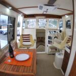 In contrast to the exterior, the textured white gel coat interior finish is rather plain in appearance, but it’s practical and easy to keep clean. Exposed wiring runs and soft flexible covers over much of the onboard equipment suggest a simple approach that should appeal to anyone who appreciate access over aesthetics.