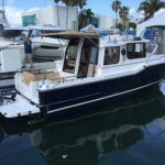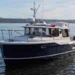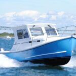 The high-profile cabin house provides a spacious salon, with large, tempered-glass windows and twin pilot doors for access to the foredeck. The latest Digby model offers an optional upgrade to a solid teak interior. The extended hardtop is a great place to store a dinghy, and provisions have been made to mount a manual lift. The 246’s trailerability, minimal draft and climate-controlled pilothouse are big selling points, but its greatest attribute may be efficiency.