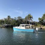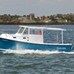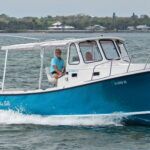 He has only built two Acadia 25 outboards thus far, and one of them was nearby on Siesta Key: Liberty, owned by Mark and Jackie Barry. Lit by the morning sun, she gleamed in her lift behind their home. Her hull was painted with Awlgrip “Boston Whaler Blue,” picked by Jackie.