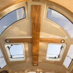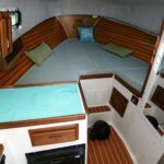 Three large hatches in the aft deck reveal all the major systems. The components required for fuel, water, electrical and cooking are all contained in sealed compartments with appropriate ventilation and drainage. Flexible seating arrangements, a clever layout, a below-deck Pullman berth, generous use of ports and proper proportion all make her seem much larger than her actual size. If I’m being picky, one small improvement I might suggest is to rethink the edge of the bottom step into the forward stateroom, as it is not radiused and could be an ankle biter, although hardly a deal breaker. The overhead includes a number of skylights—some fixed, some operable. A large port behind the settee opens up to the aft deck. All of this glass enhances the feeling of open space in the salon.