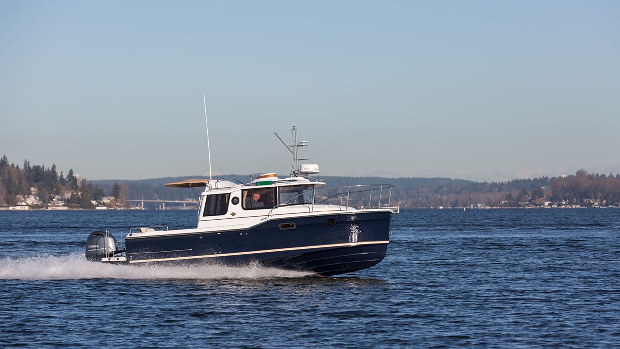 I inspected the R-23 with Dan Callahan, sales manager at Edgewater Yachts in Bradenton, Florida. Surrounded by more conventional outboard boats, the R-23 stood out with her bright navy hull and matchless tug-like design. This latest version features a curved vertical windscreen shaded by a well-proportioned brow.