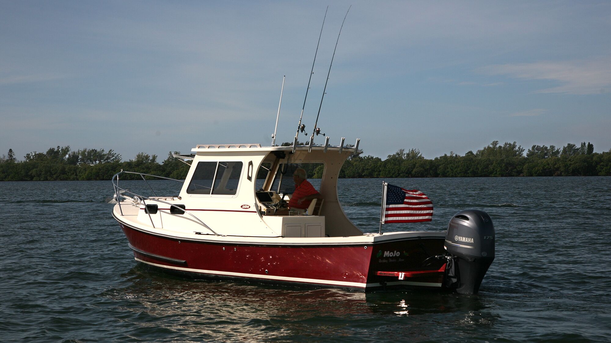 MoJo is powered by a single 175-horsepower Yamaha mounted on an optional transom bracket—which I recommend as it provides a more usable aft deck, further isolates the already quiet four-stroke, and provides for a swim platform with hinge transom door access.