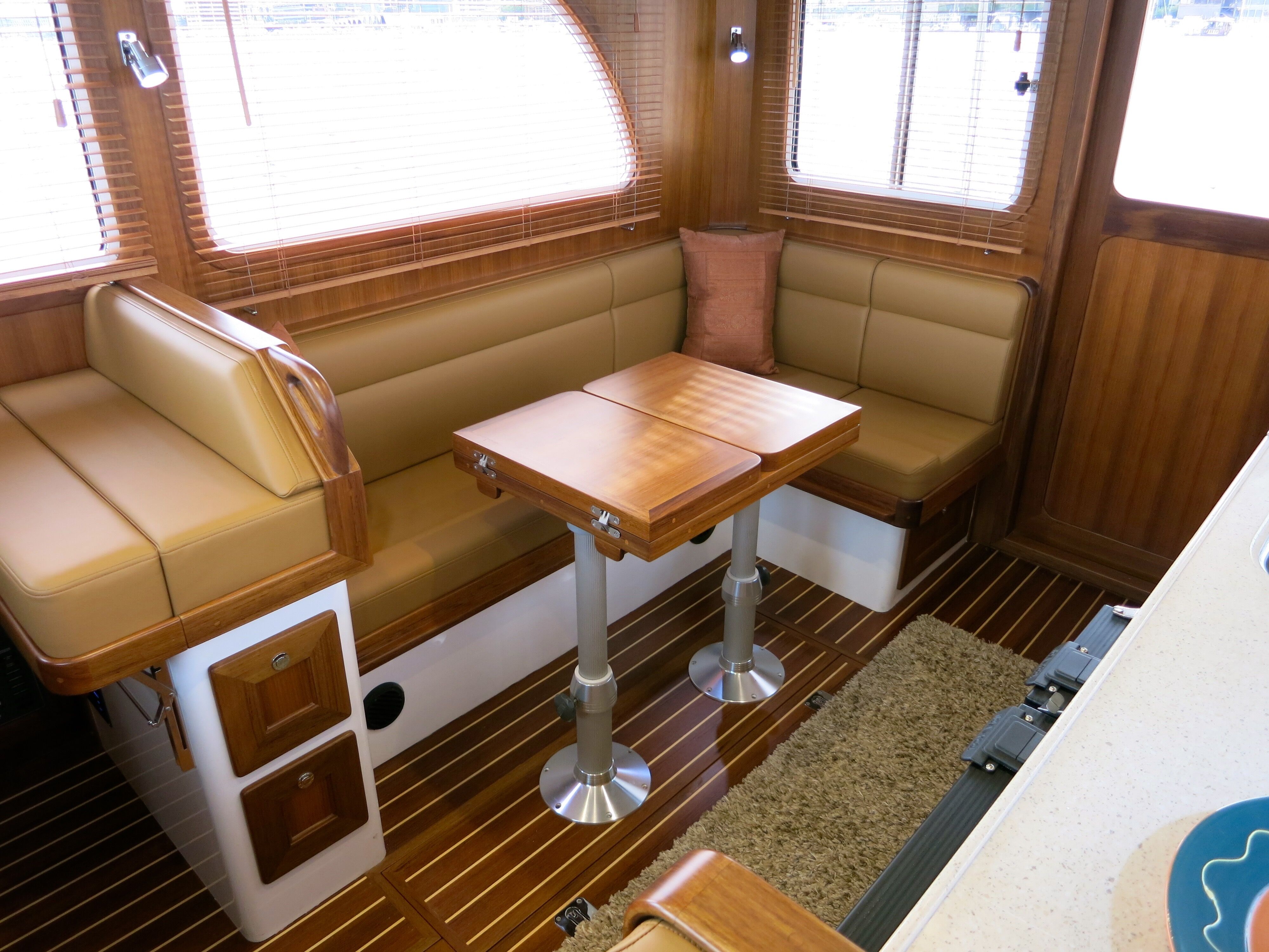 Stepping inside, headroom and interior volume are the most obvious wins with the new boat. To starboard lies an L-shape settee opposite a bench seat. The settee table drops to allow sleeping accommodations for two more adults, and the berth itself is plenty long for that purpose.