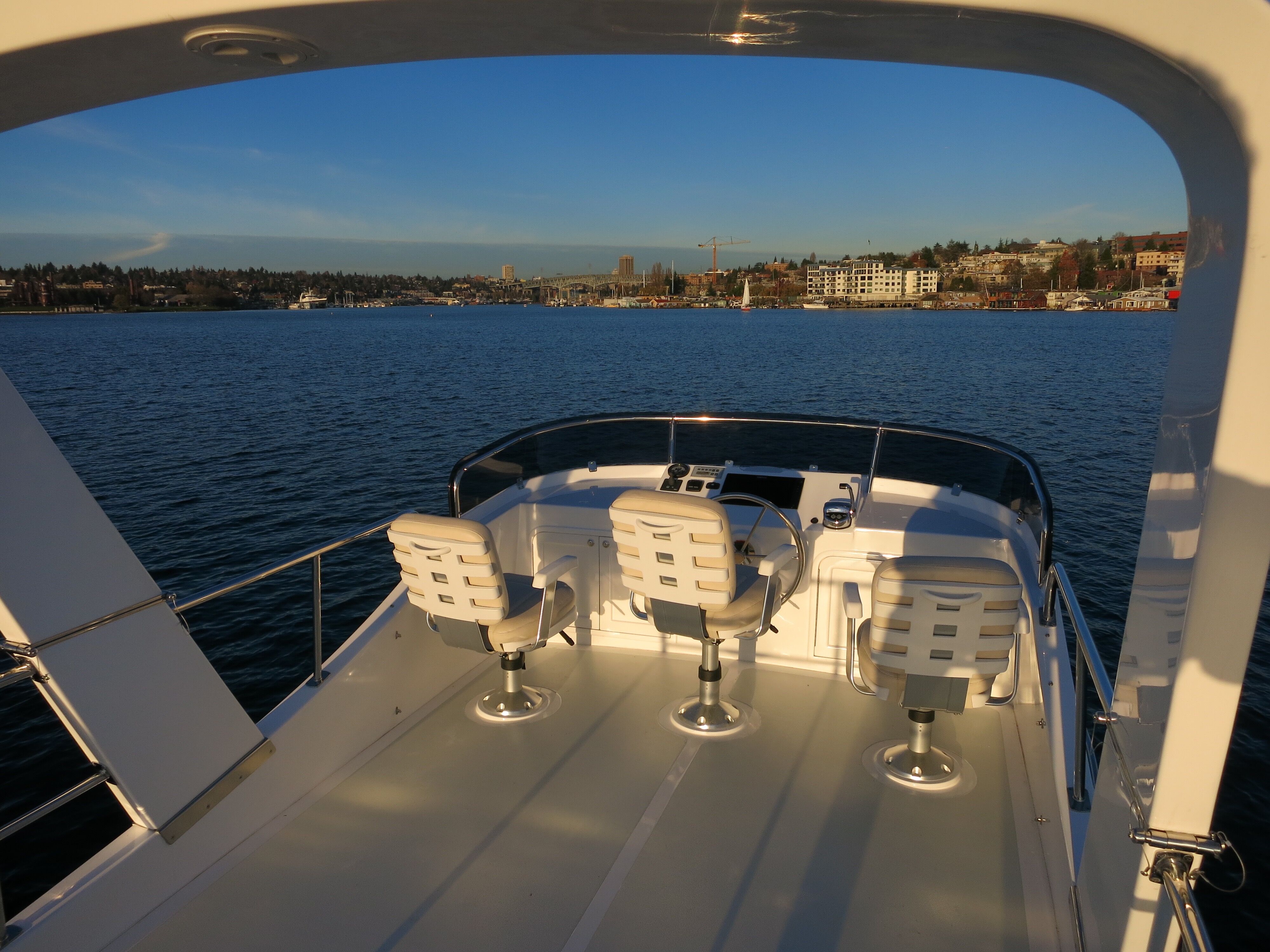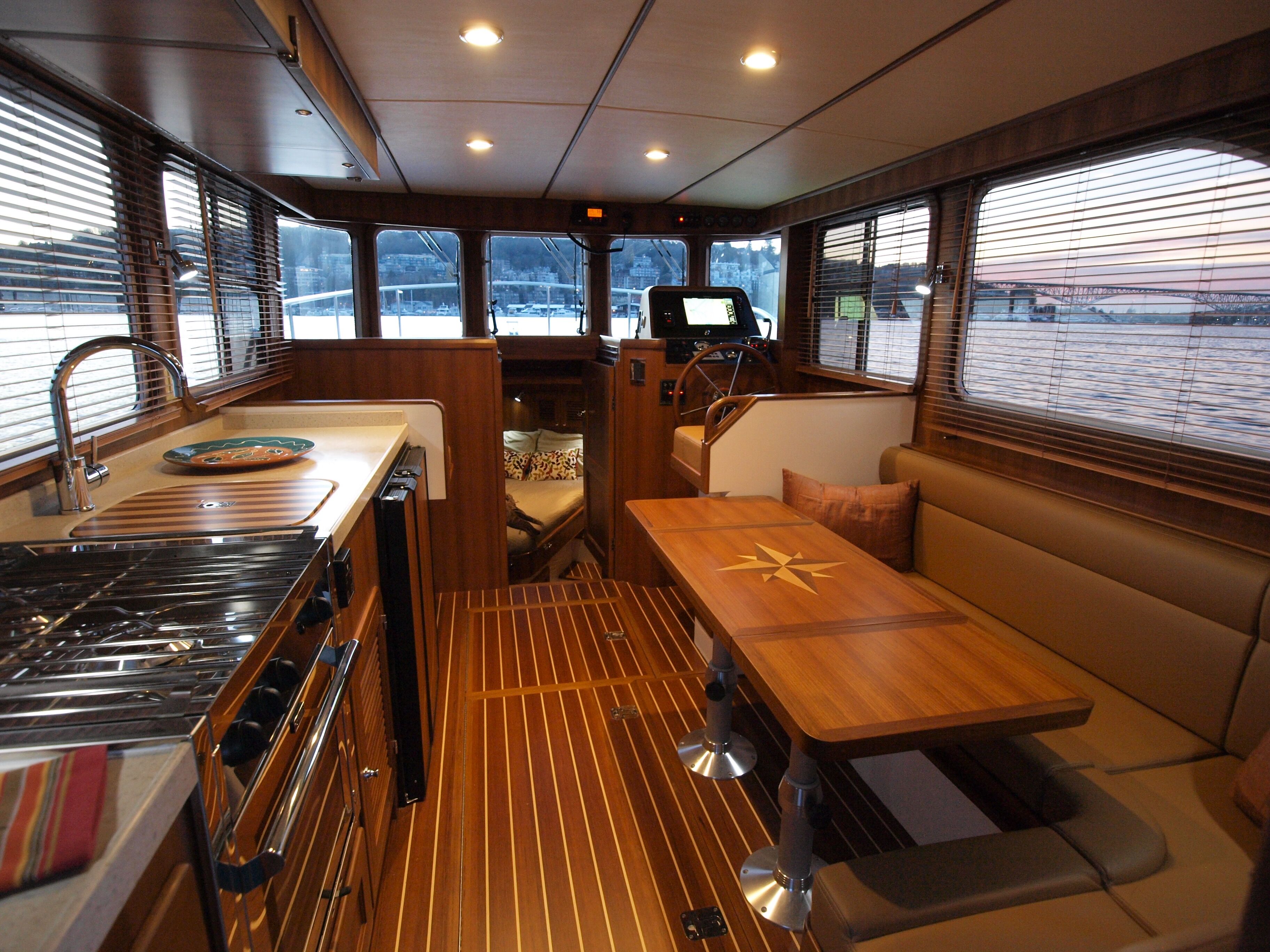 When the tooling for the Camano was acquired by Waterline Boats, one of the only things that they didn’t change was the hull design. Proven and time-tested, the 31 Sedan sits on the same 1990 Bob Warman-designed(Note: this was corrected from the printed version of the story.) semi-displacement hull as all Camano-branded boats. “There was no need to change a good thing,” said Scott Helker, Waterline’s owner. “The hull is stable underway and versatile in a wide range of speeds up to 13 knots.” The hull construction is solid fiberglass below the waterline; vacuum-bagged, resin-infused in the topsides and superstructure. Total dry weight is just 12,000 pounds. The most significant changes to the original design were made to the house in order to improve headroom and overall interior volume. Additional changes were made to how water drains from the flybridge, and the interior windows and frames were re-configured to enhance visibility from the helm and saloon.