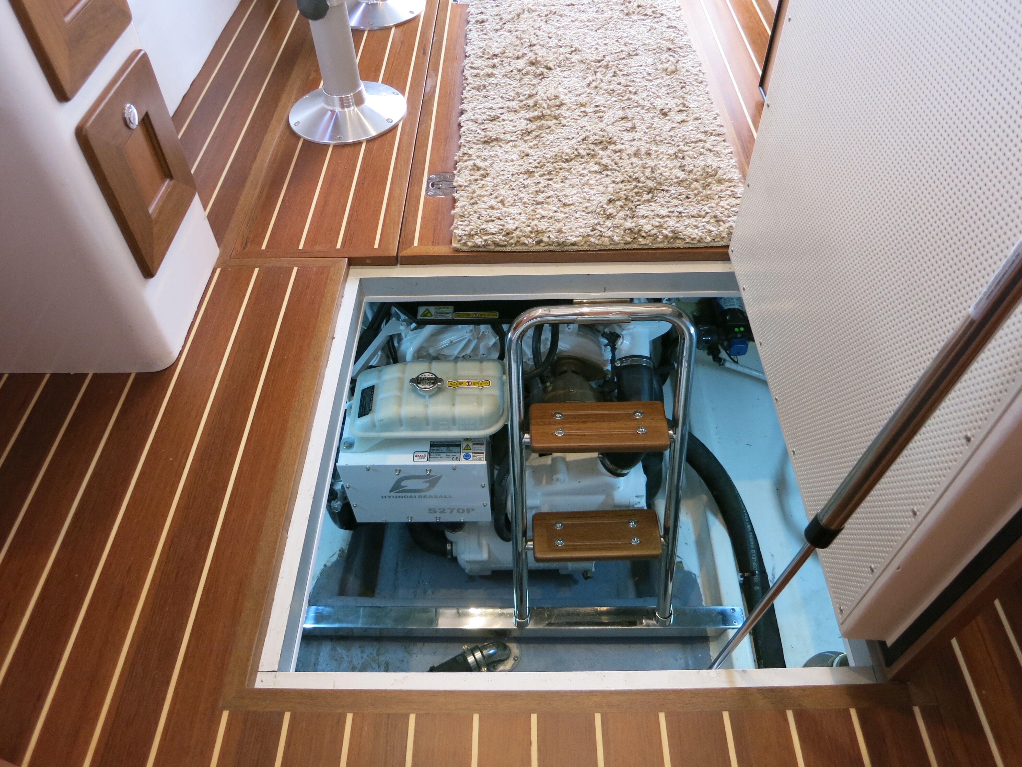 While re-engineering other parts of the Camano, Waterline found a perfect power pairing for the 31 Sedan. Hyundai may not be a recognized leader in marine propulsion in the United States, but the Korean company is a leading supplier of motors for commercial markets in Europe, and even supplies the power for 40 boats in the Venetian vaporetti fleet. After becoming enamored with the quiet-running engine, Helker signed up to install the Seasall S270 V-6, electronically-controlled common-rail 3.0-liter diesel in the first few 31s. Hyundai configured the 270-horsepower motor specifically for this application (More info on the Seasall Engine here).