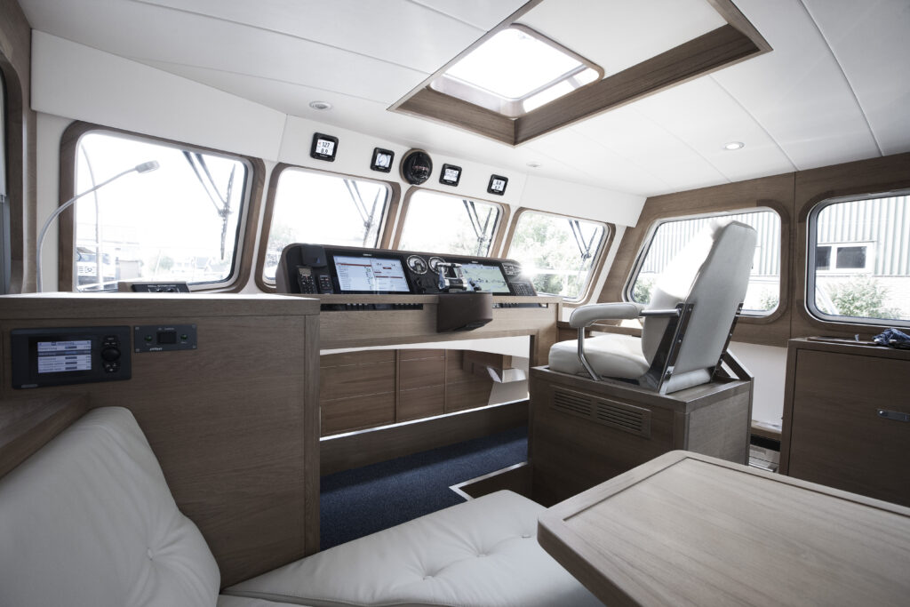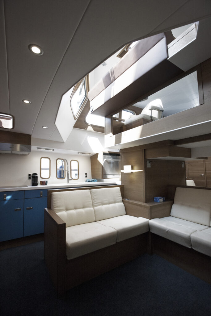 The builder is working on Hull No. 5 for an American client who expects to take delivery in the Mediterranean and spend time on the French canal system. The 50CLR’s narrow beam and hydraulic mast allows transit without compromise.