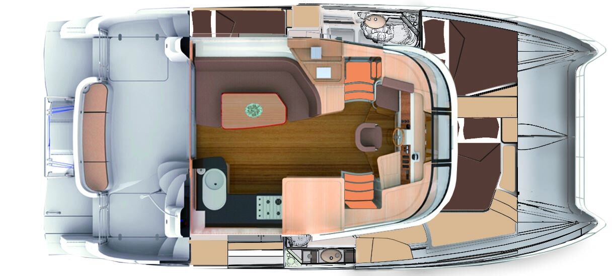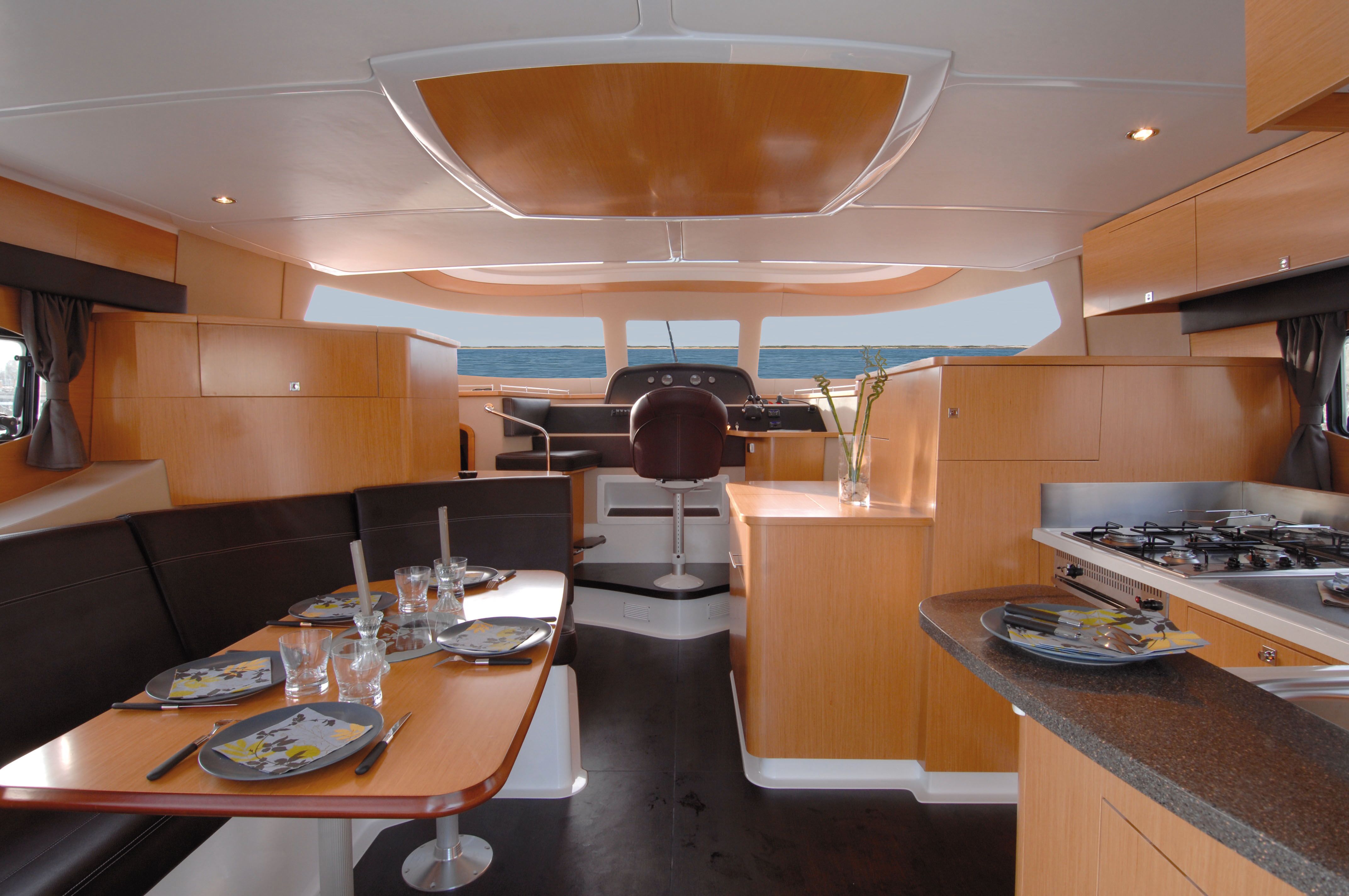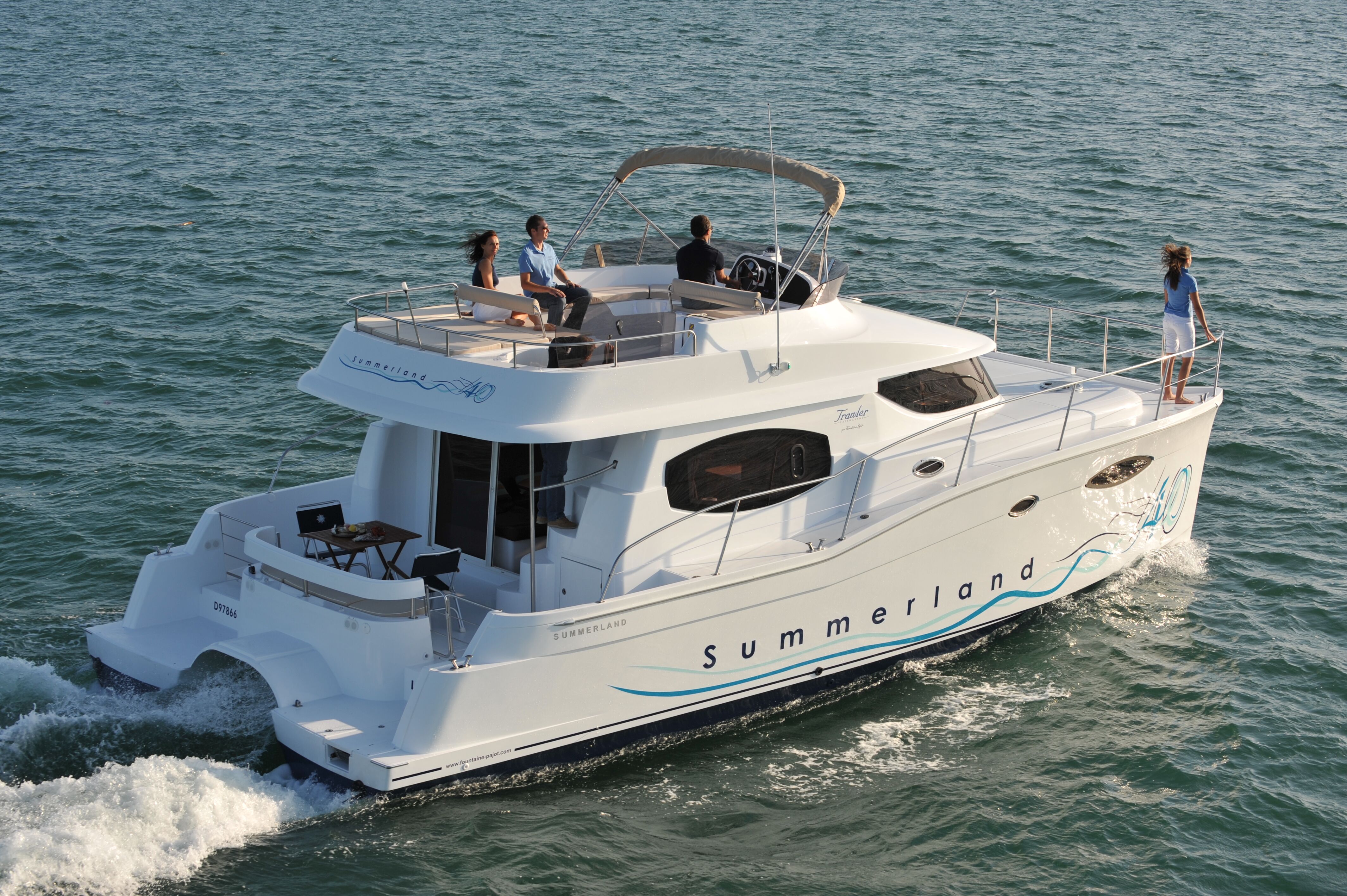 Awhile back, I had the opportunity to tour one of the first Summerland 40 power cats to come to the U.S. and to get out on the water for a test drive. Walking down the docks to join Hélène de Fontainieu, who handles marketing and public relations for Fountaine Pajot, I stopped to take a long look from a distance. The high freeboard, reverse sheer with a break and the flowing aerodynamic lines of the cabin and flybridge all spoke of a hull that was designed to handle open water and substantial sea state. In fact, the Summerland 40 is certified EC Category B for eight persons, meaning it can withstand wave heights up to 13 feet and winds up to 41 knots.