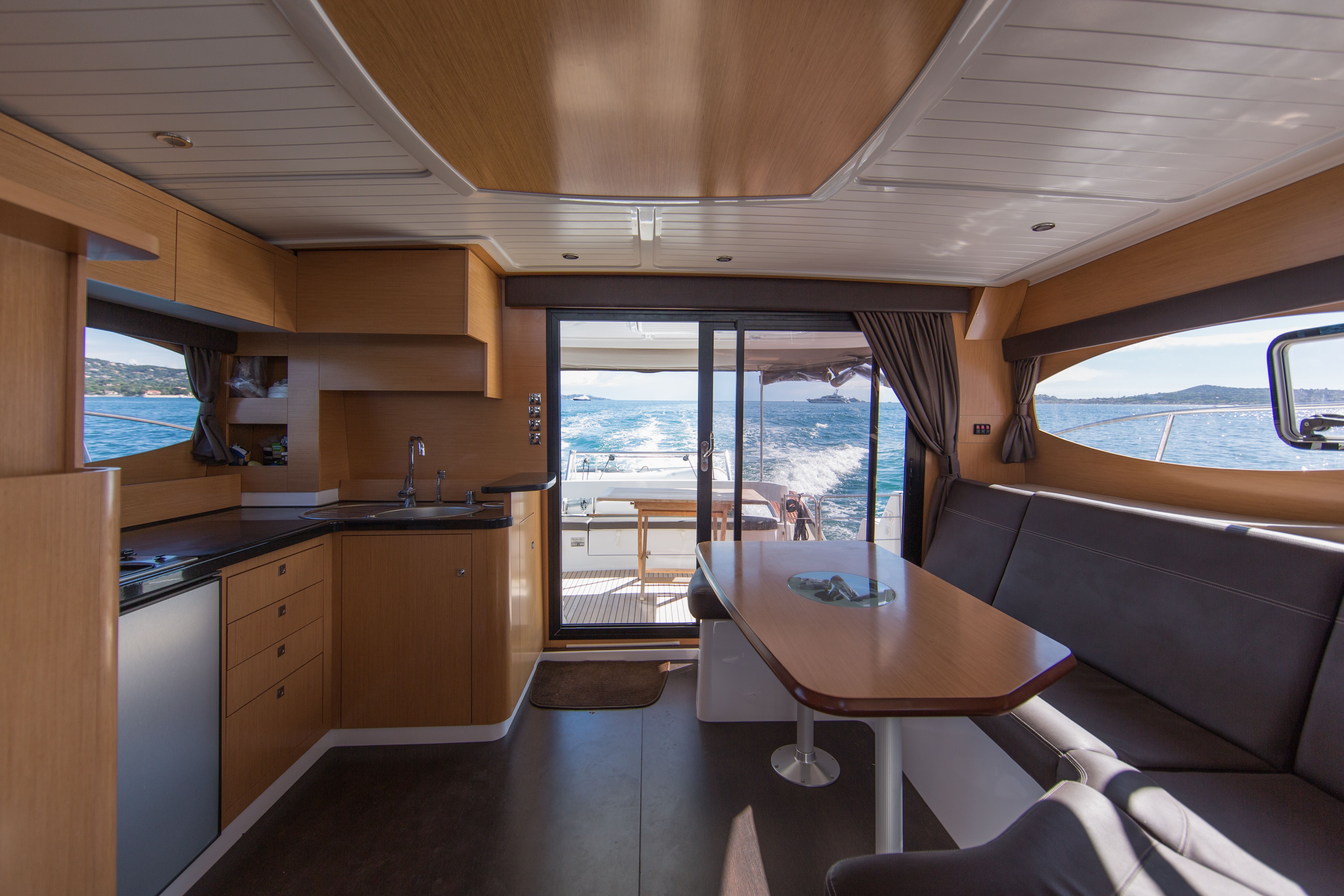 The flybridge is equipped with an opening Altuglass hatch to prevent accidental falls. I would like to have seen a stainless steel handrail, to add security when stepping up to the flybridge or down to the staircase. And while there is a low handrail surrounding the after portion of the flybridge, there is none around the sides or over the top of the curved venturi windscreen. The massive sunpad aft includes a removable backrest, and the comfortable cushions wrap around the port side—more than enough room for eight guests. There is a molded bench seat for two abaft of the helm, with the wheel almost on the centerline. The helm console is large enough for a good-sized multi-function display (MFD), plus a full range of performance instruments. Sight lines on the flybridge are unencumbered, and the view down the stairway gave an excellent perspective on the starboard aft quarter, invaluable when backing into a slip.