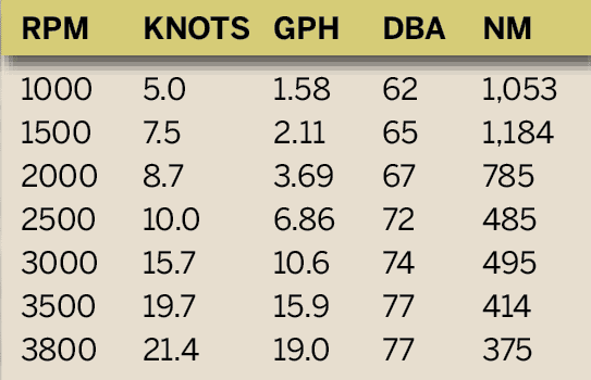 Test Conditions: Air temperature: 71 degrees; Humidity: 60 percent; Wind: 8 knots; Waves: 1-2 feet. Speeds are two-way averages measured with the onboard GPS. Fuel consumption based on Volvo Penta data. Range is based on 90% of advertised fuel capacity. Sound levels measured at the lower helm (65 dBA is the level of normal conversation). Condition of bottom: unknown. Fuel load: 50%. Water: full. Four people aboard.