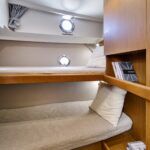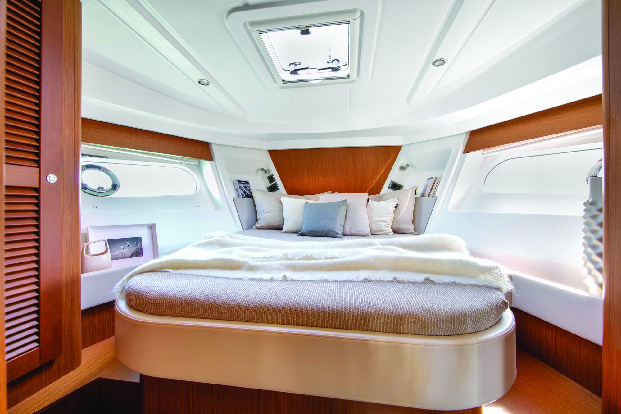 With a centerline queen-sized bunk and slight walkaround, the master stateroom is a significant improvement over the 34 where one had to climb in at the foot of the bed over a shin-bruising coaming. The forward cabin has larger portholes than its predecessor, which makes the cabin feel larger and lighter. The guest stateroom has two bunk beds and is spacious enough to not feel cramped even with two adults. The accommodations are perfect for the cruising family with children or owners who like to have occasional guests.
