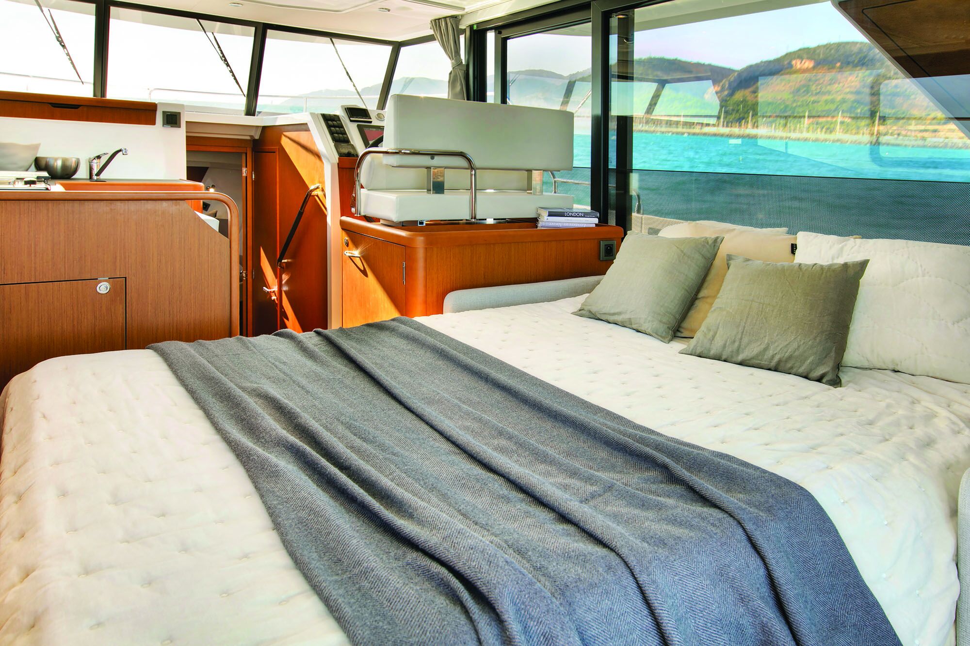 Stepping in the side door puts you at a small but organized helm. Opposite the helm is a utilitarian U-shape galley with sink, stove, and oven. A large fridge is located across the centerline under the helm seat. Just aft of the galley and hidden behind some cabinet doors is a drawer freezer for frosty drink ice and provisioning for longer trips. Beneteau has moved away from the gimbaled stove-and-oven combo and replaced it with a built-in stove and separate cooktop. The double basin sink is forward and has countertop covers to use while prepping meals. The outer section of the aft end of the galley can either serve as additional counter space or be fitted with a cushion so that someone can sit and look forward, next to the helm, while underway. This is a standard configuration.