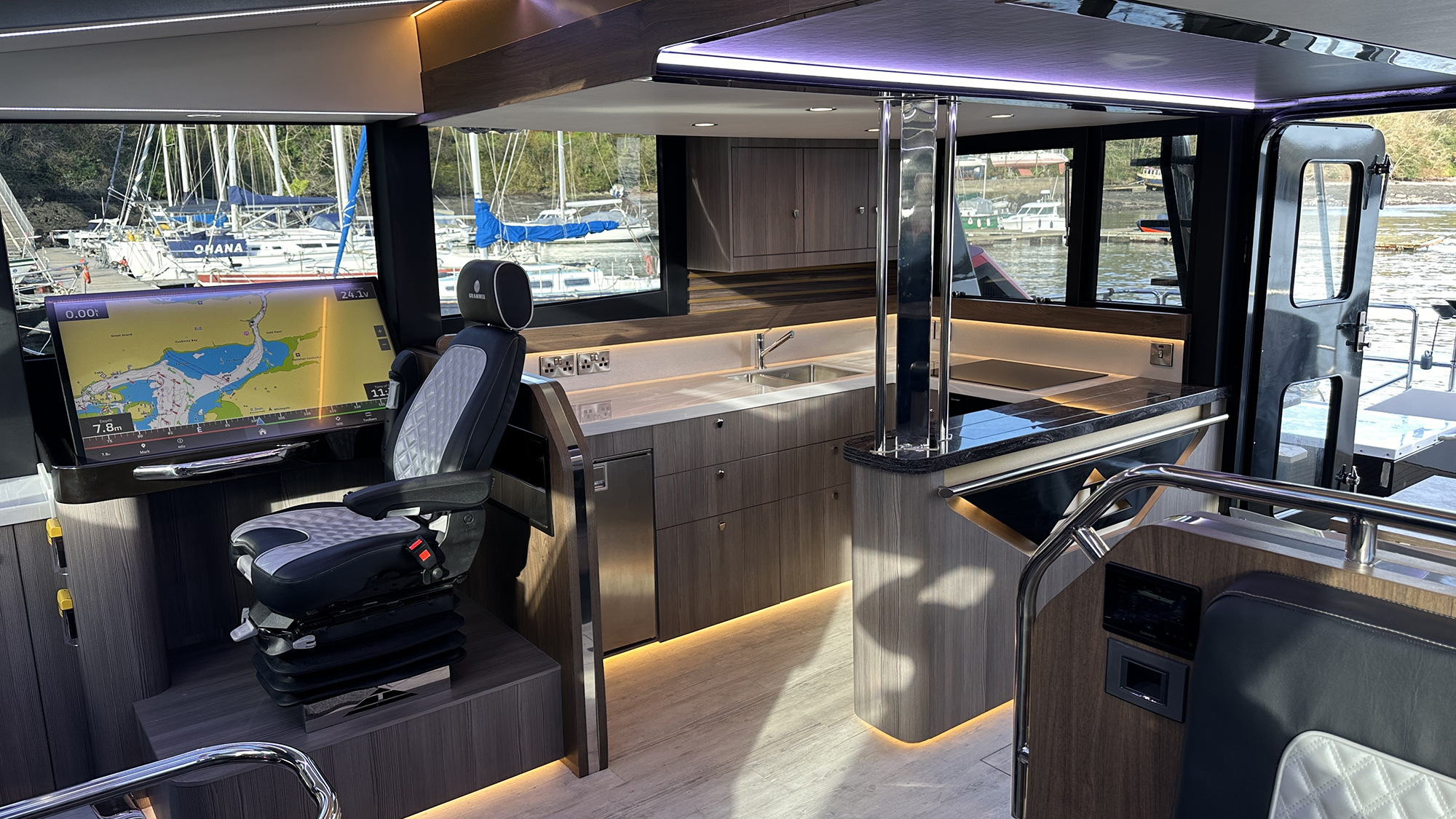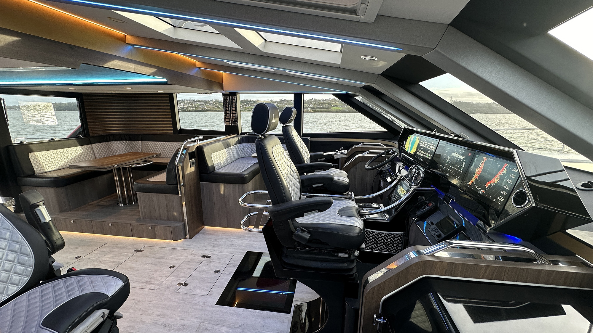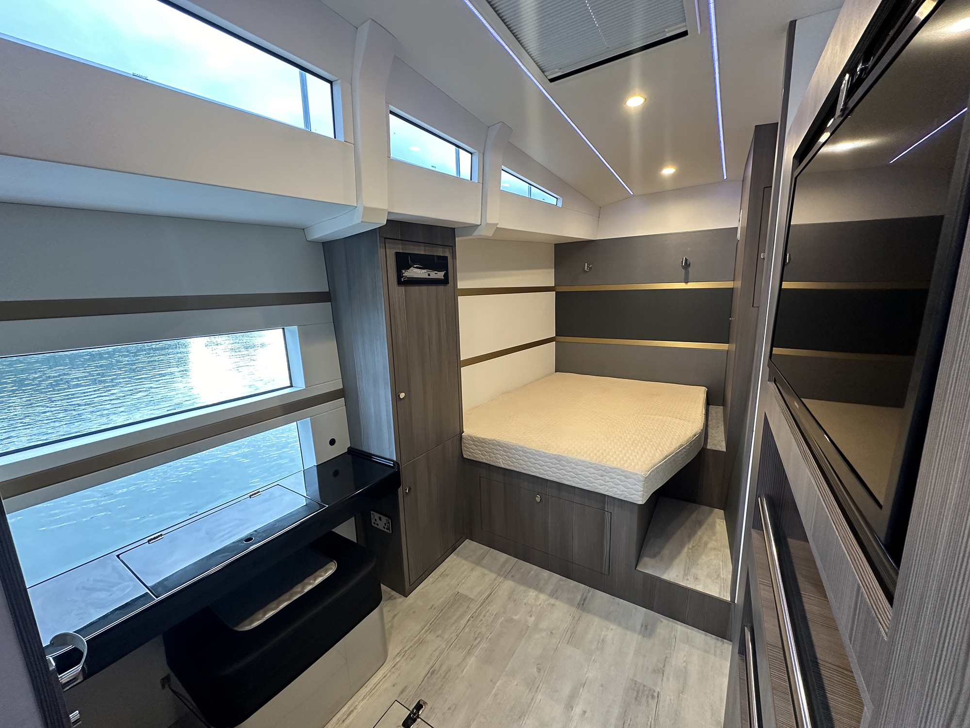 Hull No. 1 has two en suite staterooms and crew quarters for two. The helm station is a study in modern maritime technology. There’s a centralized, sleek floating console equipped with a quartet of Garmin multifunction displays, and with FLIR thermal imaging in easy reach.