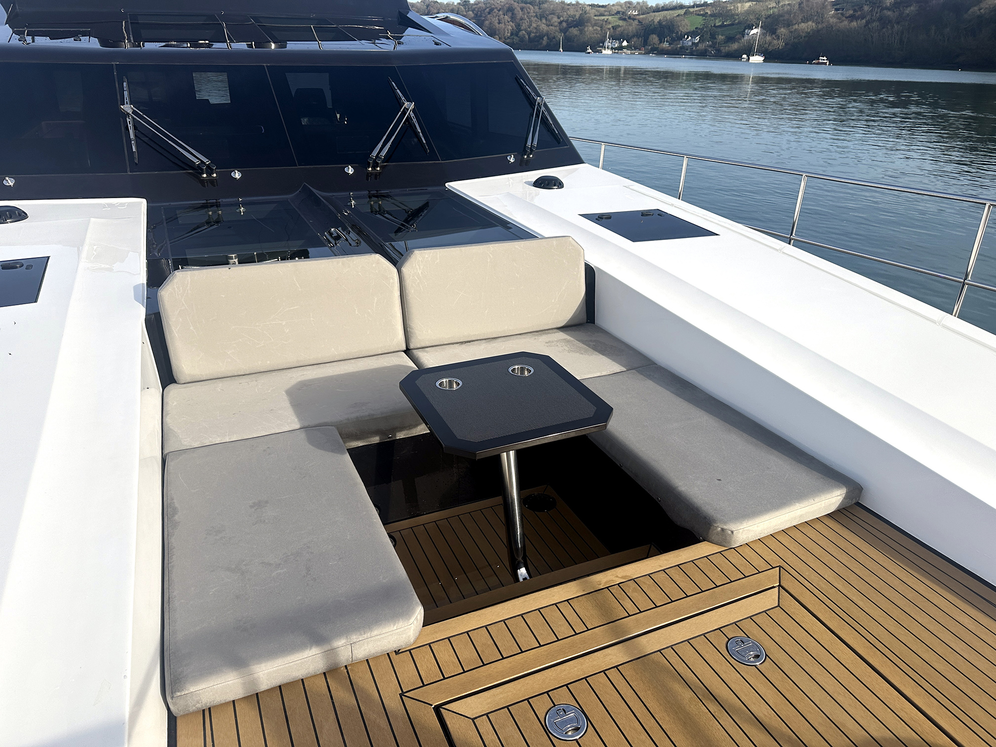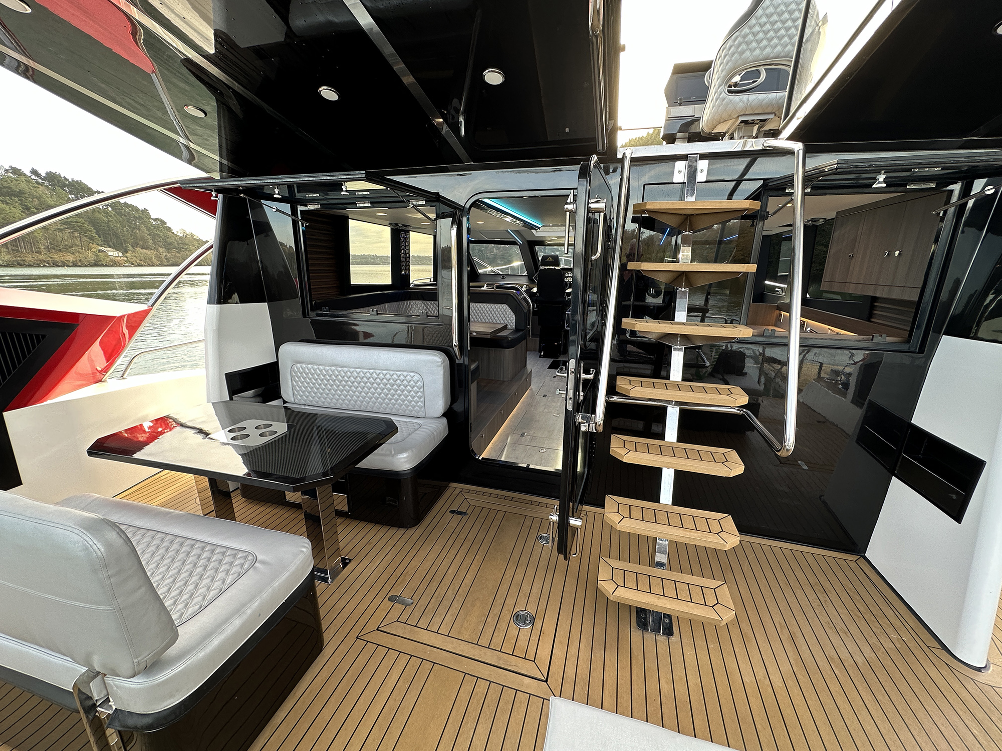 Propulsion is twin 1,550-hp MANs mated to France Helices surface drives. During my time aboard Hull No. 1, wind speeds exceeded 24 knots, and moderate seas created whitecaps around the harbor entrance. We punched through effortlessly. The hull lifted out of the sea, minimizing drag and allowing us to skim over the waves with stability and control.