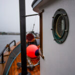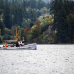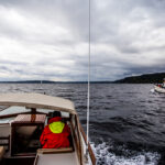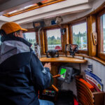 I enlist my dad to help run the 25 with me so I can photograph Josephine on the water as we head the 60 or so nautical miles down to the southern end of Puget Sound. Light wind and a cool drizzle are in the mix for the day’s weather as we greet Sam on the docks. The engines on both boats are already warmed up and, after a quick lesson on the particulars of our picnic-style boat, we’re ready to push off.