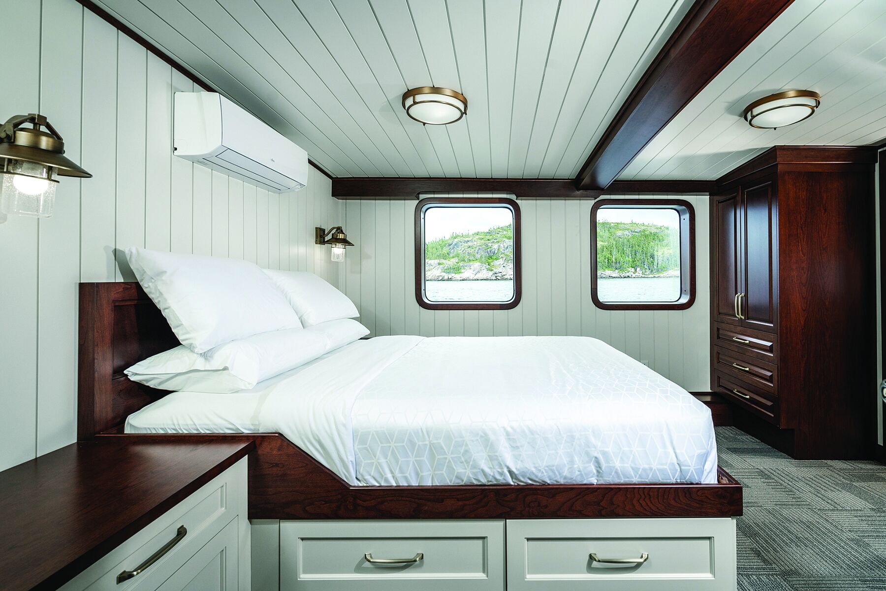 Abaft the galley are a dining area and seating with window views. The center of attention is an honest-to-goodness wood-burning stove above a brick-and-steel fire barrier. “That’s my backup if the climate system fails,” the owner says. “There’s nothing like a fire. It’s just fabulous.”