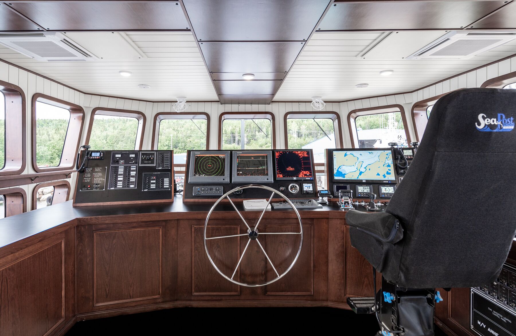While the Anne S. Pierce has modern communications equipment from Starlink and KVH, the owner favored more traditional systems at the three-seat helm. The seafloor is visualized with a vintage Furuno setup. “It’s from the 1990s, but it’s still supported,” he said. “We also have a 25-kilowatt commercial radar and TimeZero software running off a new marine PC. The boat doesn’t have electric switching, and all the systems, including the joystick control, are independent.”