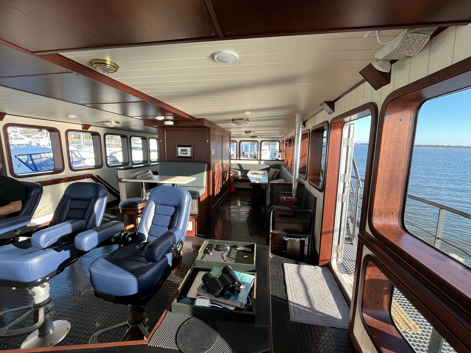 There are so many things to like aboard the refurbished boat. Hidden in the Glovertown-built smokestack, a dumbwaiter runs down to the galley. Gazing out over the main deck, an owner could navigate from the outdoor helm. The array supporting the navigation lights can be lowered on a hinge for easy bulb replacement. And, out on the water, the Anne S. Pierce flattens swells like a tank.