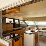 The C108 has a 37-foot-6-inch length overall with three berths (the dinette converts to a fourth berth). There’s an enclosed head with a shower, and a roomy salon similar to the one on the larger C120. A fundamental feature on the C108, and many Aspens, is the bulkhead between the salon and cockpit. Almost the whole section is glass that can be closed or opened to combine the indoor and outdoor space, which itself is partially covered. An exterior bar with two seats is near the dinette. The C108 also accommodates a dinghy that is secured to a raised metal rack over the outboard engines.
