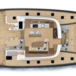 The generous volumes within the hulls can be easily customized to match any navigation plan and lifestyle. The alfresco relaxation areas of the yacht include a large bow terrace and an aft cockpit with plenty of space for dining and lounging. The aft hydraulic platform provides a fantastic spot for sunning and enjoying water sports. The flybridge can house a spa pool, a bar, a dining area and oversize sunpads. An aft garage and aft platform allows the 60 to take her tender, jet ski and toys anywhere she goes.