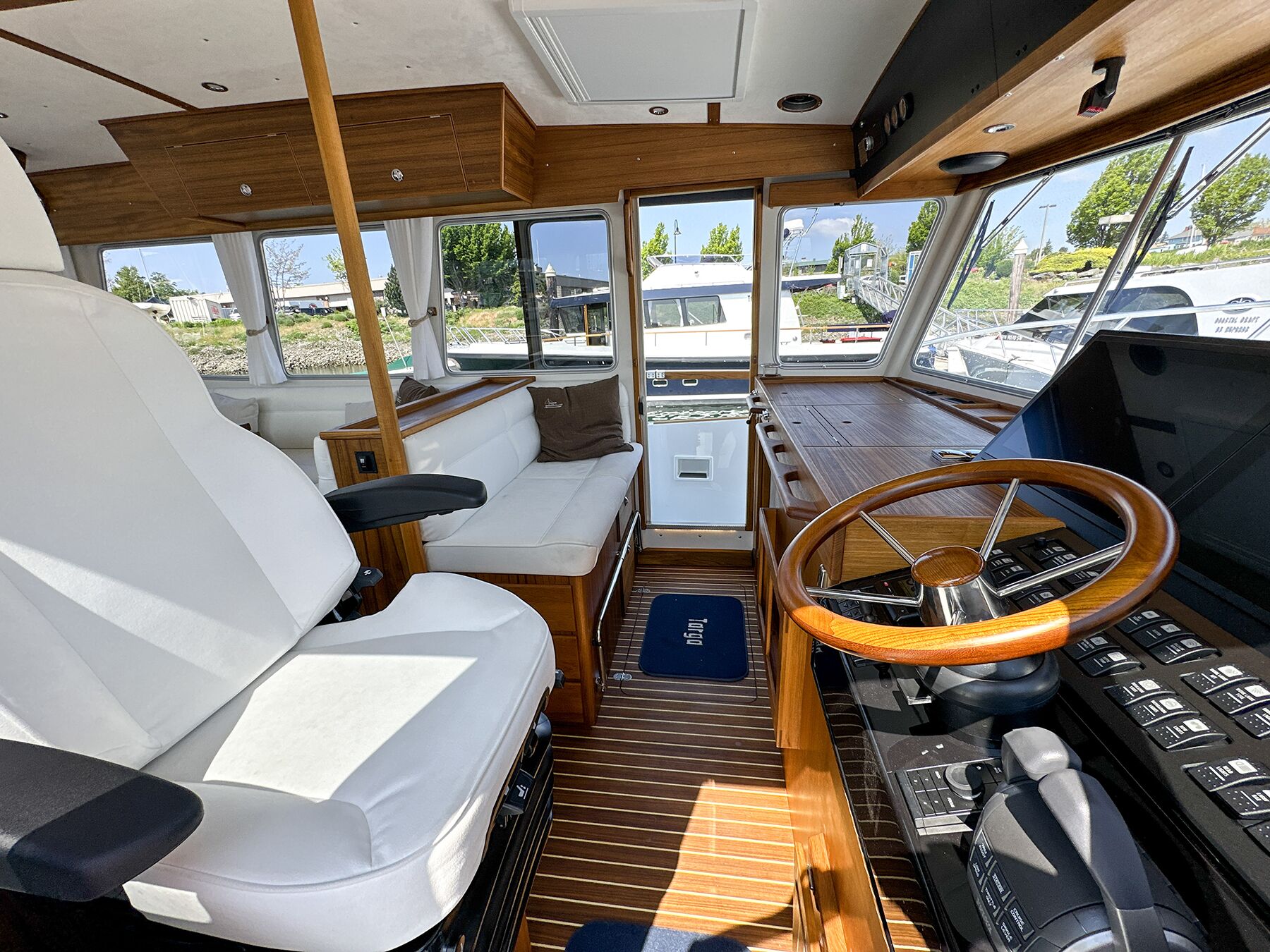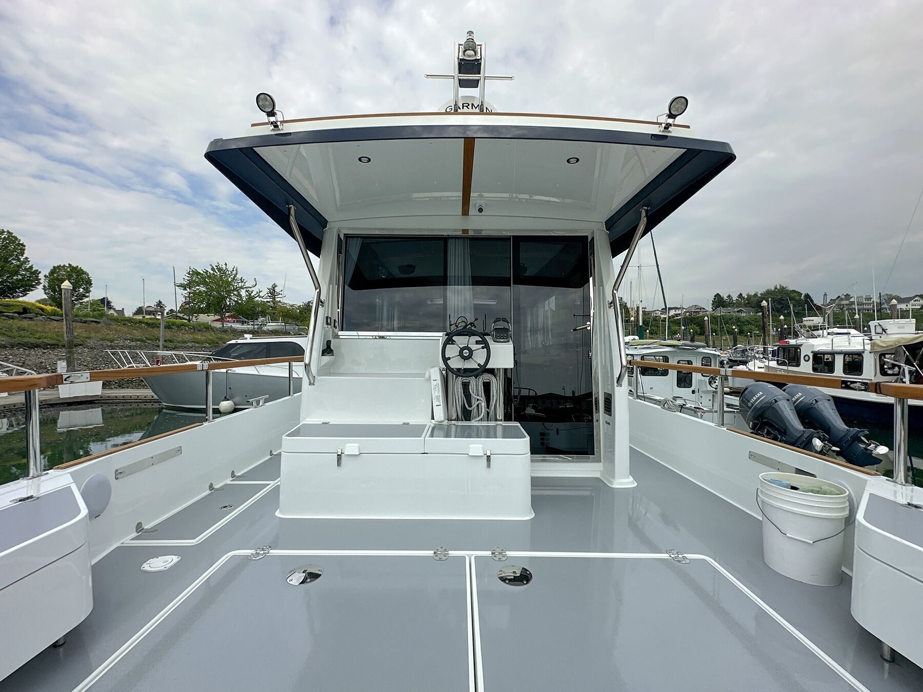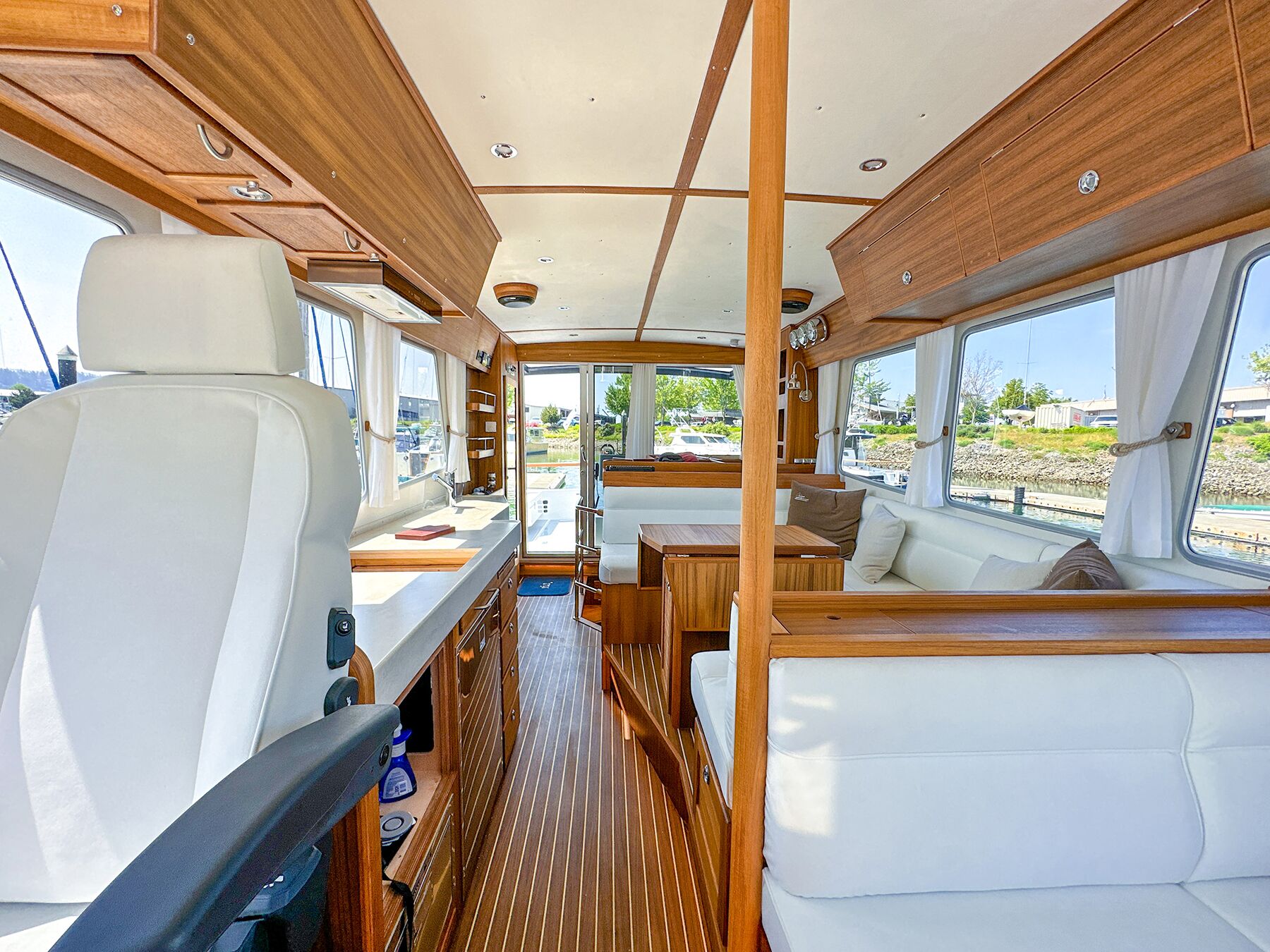 decks are optional, but nearly all his clients in the Pacific Northwest have chosen nonslip decks and stainless rails. Her hardtop extends to shade roughly half of the boat’s cockpit, but since she’s a semi-custom build, a retractable shade can be added. A wing station with a multifunction display, wheel, throttles and joystick offers the skipper a well-appointed alternative to marina maneuvers from the pilothouse.