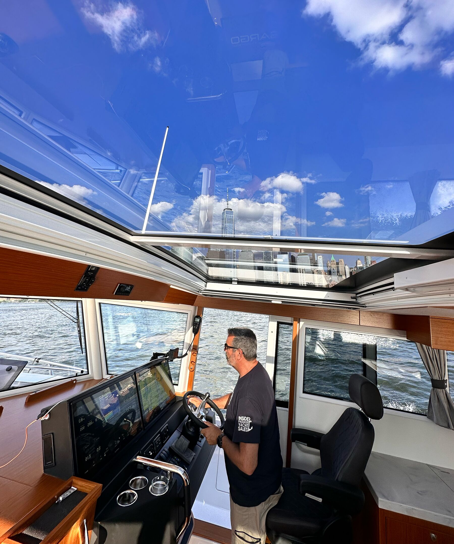 She topped out at just under 34 knots and was confident and quiet (60 decibels) at 15.2 knots, with a range of 321 nm at this speed. The sun’s glare was no match for the solar screens on the forward and side-facing windows. I spent the rest of the time on the river attempting to unnerve her at 24 knots, to no avail, so I headed back to Jersey City’s Liberty Landing Marina.