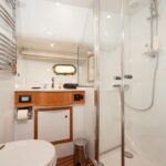 The forward double is much the same as the one aft but the head has two doors and so also serves as the day head. The third cabin is alongside the engine compartment opposite the galley and has access from the saloon. Here, there are two bunks and a compact head and Elling offers this compartment as an office.